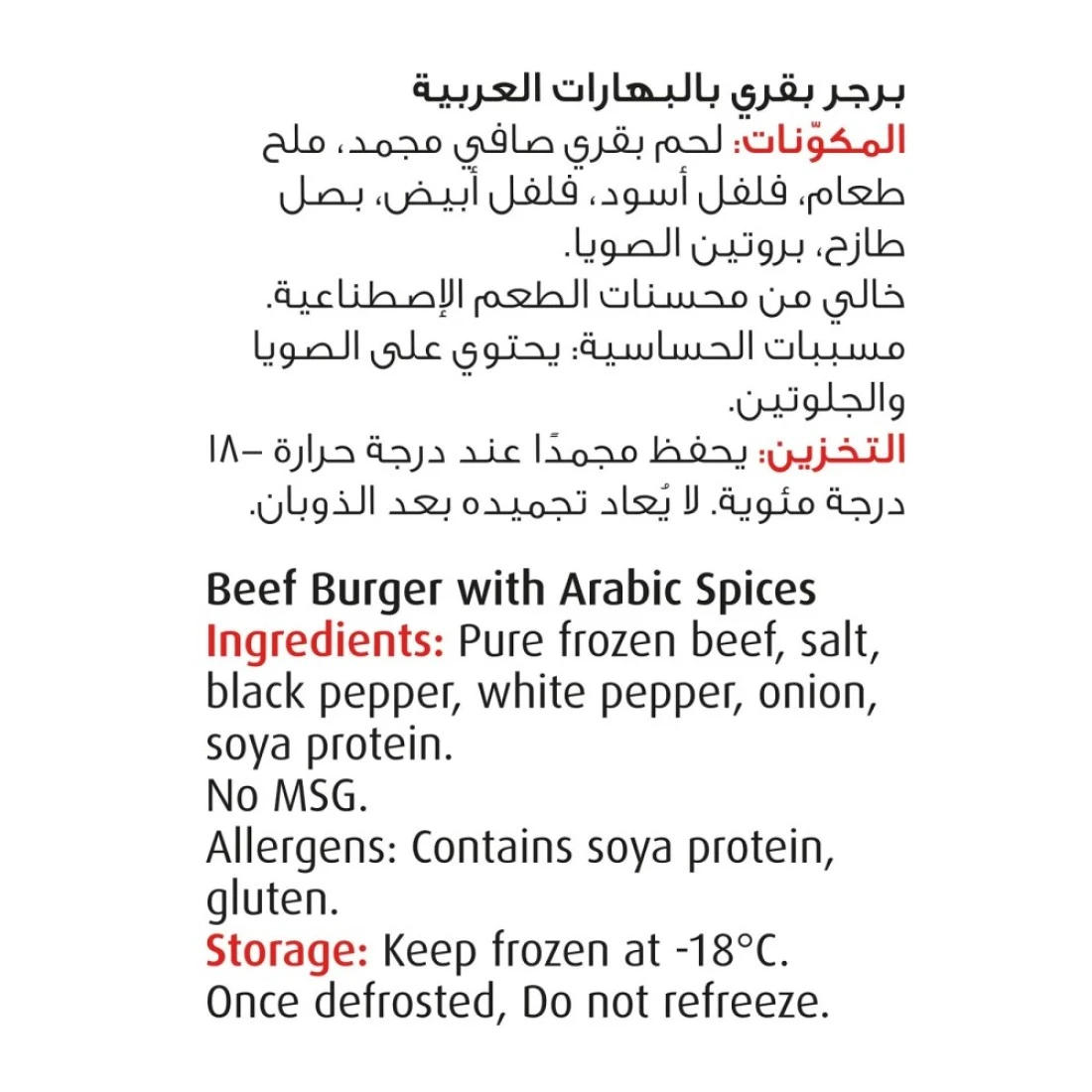 ingredients : Pure Frozen Beef, Salt, Black Pepper, White Pepper, Onion, Soya Protein