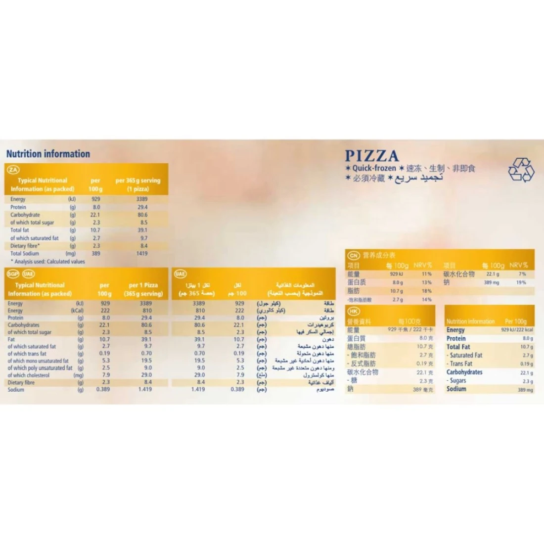 ingredients : Wheat Flour 25%, Tomato Puree 16%, Mushrooms 15% ,Cheese (Edam, Firmed Mozzarella)(Calcium Chloride), Rapeseed Oil, Water, Yeast, Salt, Sugar, Modified Starch (Distarch Phosphate Thickener), Palm Fat, Powdered Mushroom, Garlic