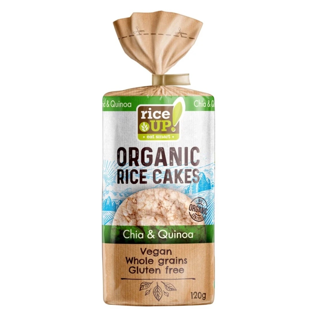 - Enjoy all natural rich in fibre crunchy healthy RiceUP Bio Organic Rice Cakes Chia and Quinoas Vegan snacks everywhere every time morning afternoon or evening in breakfast lunch or dinner in-between meals