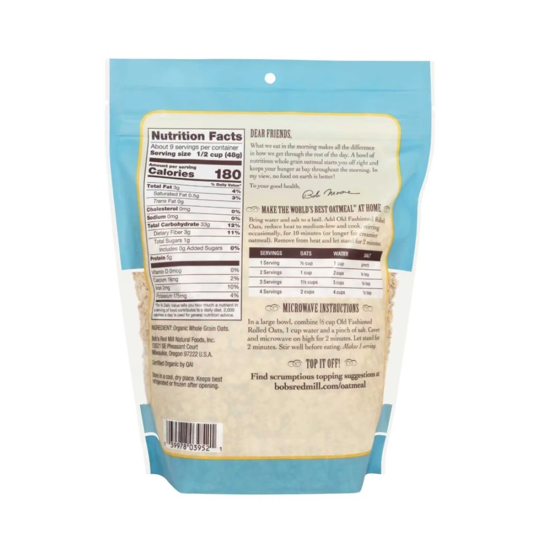 Start your day with the wholesome goodness of Bob's Red Mill Old Fashioned Rolled Oats, made from 100% whole-grain oats. These premium-quality, non-GMO oats are gently rolled to preserve their natural flavour and texture these oats are a great source of fiber protein and essential vitamins and minerals. They are also certified organic meaning they are free from any pesticides or harmful chemicals. These oats can be enjoyed on their own or used as a base for a variety of recipes including oatmeal granola and baked goods. Enjoy the clean, satisfying taste and nutrition of these classic oats in every bite!