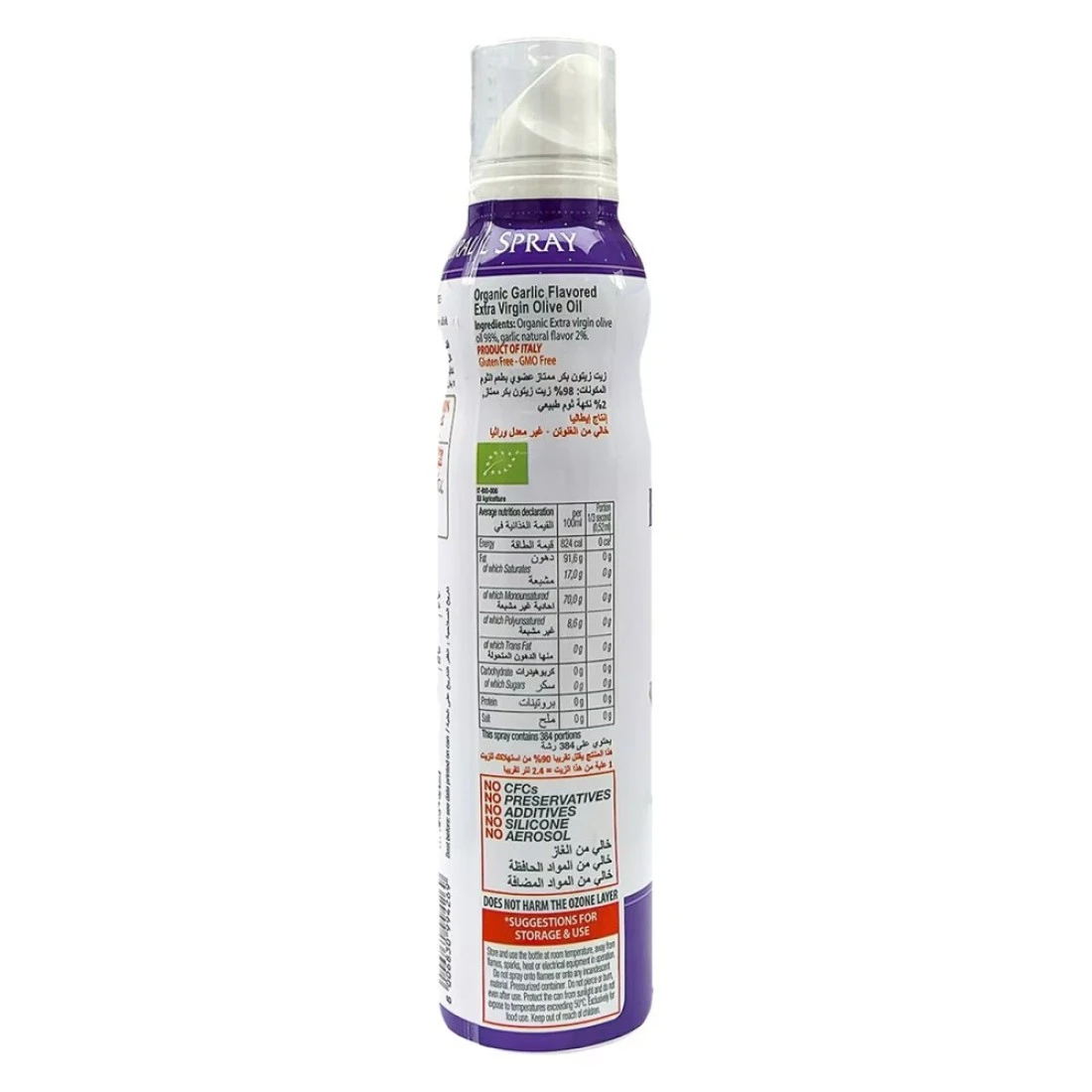 - With our special spray bottle, the Garlic Extra Virgin Olive Oil is protected from oxygen and does not contain aerosol and other unhealthy additives