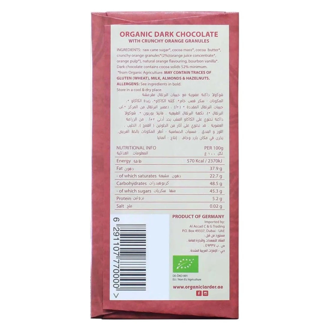Organic Larder Dark Chocolate With Orange is a delicious and indulgent treat for chocolate lovers. Made with organic ingredients, this dark chocolate bar is rich, smooth, and velvety in texture. The addition of orange in this chocolate adds a burst of citrusy flavor, creating a perfect balance between the sweetness of the chocolate and the tanginess of the orange. With a minimum of 70% cocoa content, this dark chocolate is also a great choice for those looking for a healthier option. Enjoy a piece of Organic Larder Dark Chocolate With Orange as a guilt-free indulgence or share it with friends and family.