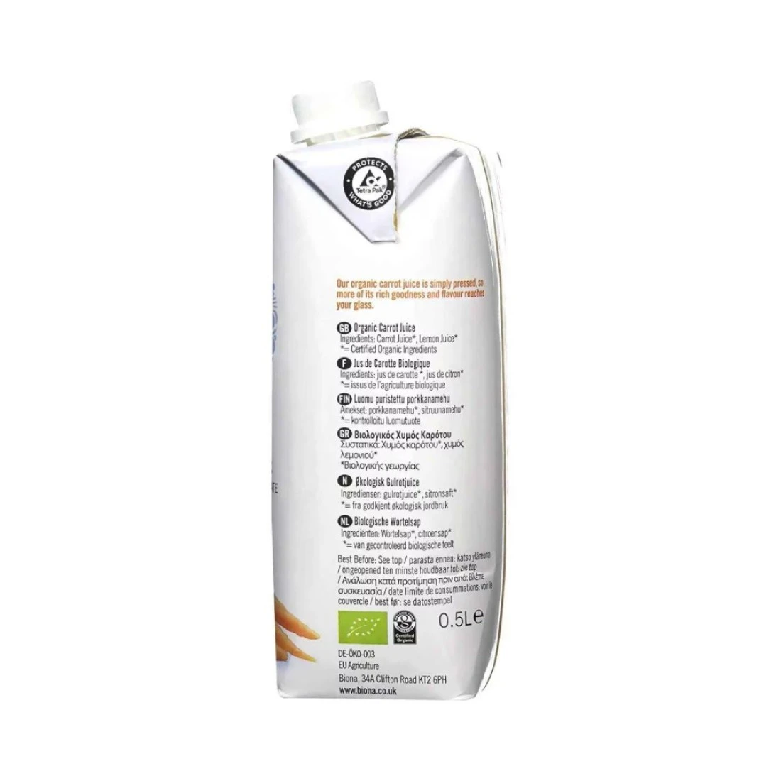 - Biona organic carrot juice distils all the crisp taste and natural goodness of one of the world's most nutritious vegetables into a delicious juice