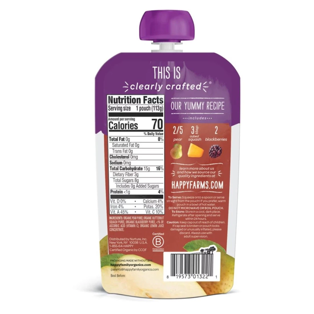 ingredients : Organic Pear Puree, Organic Butternut Squash Puree, Organic Blackberry Puree, <1% Of: Ascorbic Acid (Vitamin C), Organic Lemon Juice Concentrate