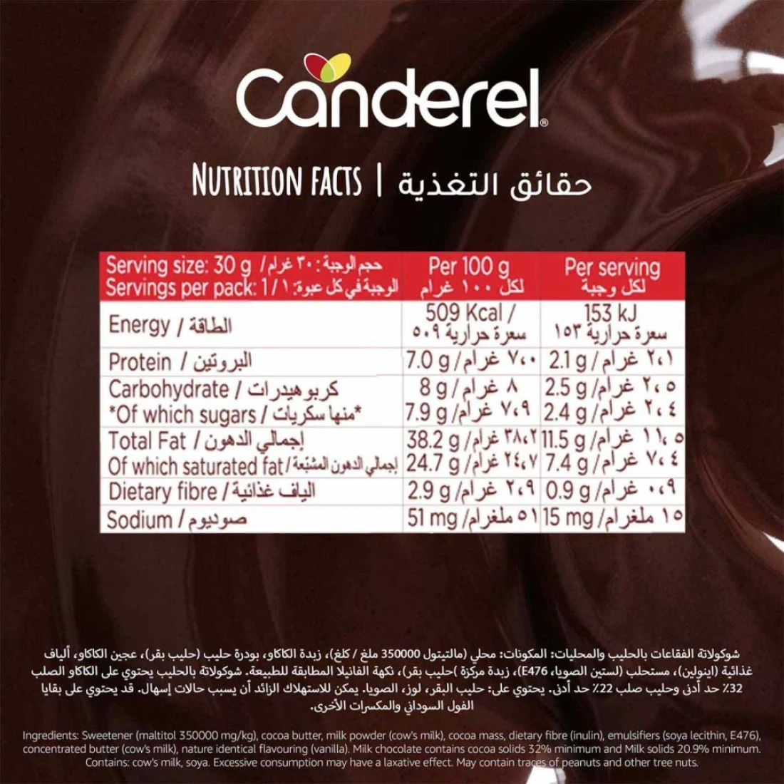 ingredients : Cocoa Butter, Sweetener (Maltitol E965-i), Inulin (Fibre), Milk Powder (Cow's Milk), Cocoa Mass, Concentrated Butter (Cow's Milk), Emulsifiers (Soya - E322, E476)), Aspartame (Non-nutritive Sweetener E951), Flavouring (Vanilla). Cocoa Solids: 34% Minimum. Milk Solid: 22% Minimum