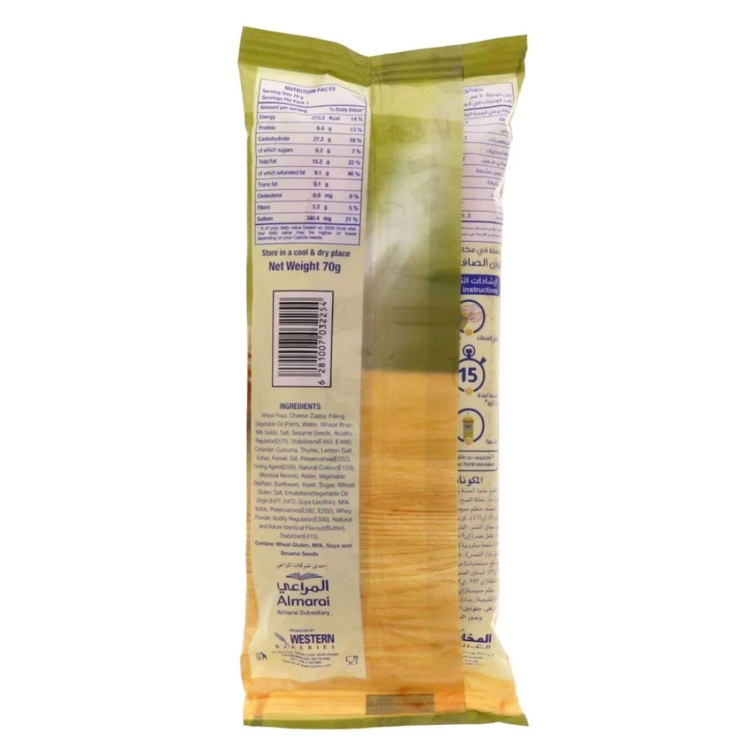 ingredients : Wheat Flour, Water, White Cheese, Vegetable Oil And Hydrogenated Vegetable Oil Palm, Contains Antioxidants: E320, E321, Sugar, Yeast, Wheat Gluten, Thyme, Sumac, Sesame Seeds, Salt, Corn Starch, Modified Potato Starch, Whey Powder, Emulsifier: Vegetable Oil Origin E471, Preservatives E282, E202, Acidulants E575, Stabilizers E460 And E466, Mineral Salt E505, Natural Colours E160a and E160b