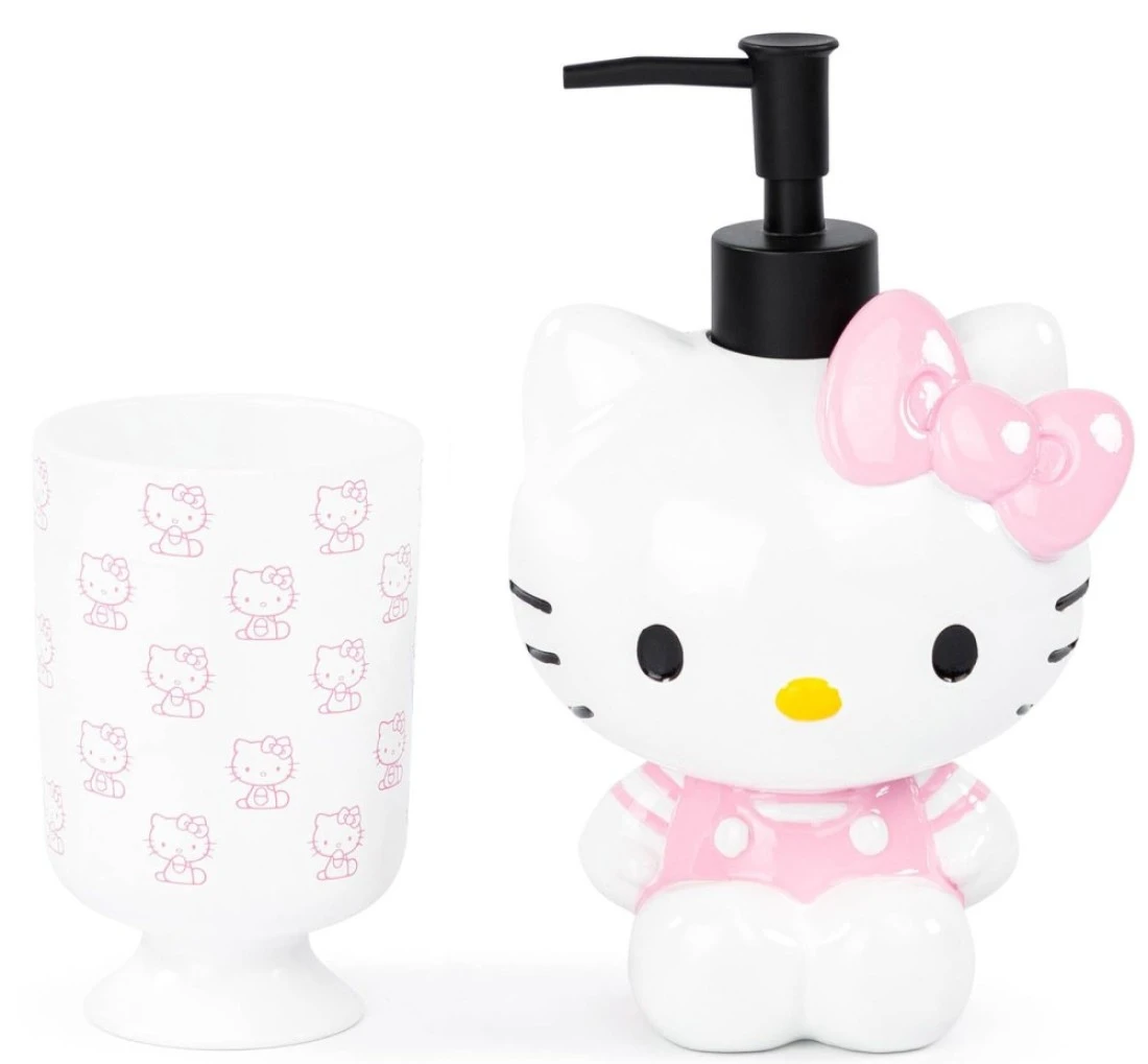 FUN & ADORABLE DESIGN - Hello Kitty lovers will adore getting the chance to decorate their bathroom with their favorite character. Bathroom tumbler measures 5 x 3 inches, and soap dispenser measures 7 x 5 inches., REFILLIBLE & EASY USE - Keeping your bathroom space organized and clutter free has never been easier. Bring the tumbler cup to work to hold your office supplies or use it to store your makeup brushes and display on your vanity! Fill the dispenser with your desired product, liquid soap, hand sanitizer, or even lotion. Keep one for your bathroom, office, or by your bed side!, GREAT GIFT - This bathroom set is an excellent gift for the Hello Kitty fan in your life. It’s the perfect way to bring the enchantment of their favorite bowtastic character into their everyday life!, SHOP THE HELLO KITTY COLLECTION - Complete your room with our other Hello Kitty products - Coordinating bedding and bath accessories available (sold separately)., OUR FAMILY COMPANY - Our company is still small and family run. We take great pride in our products and our unsurpassed customer service. We know that our wonderful customers are the reason we are in business! We offer excellent quality, non-toxic products. With our coordinating Hello Kitty accessories, you can mix and match our high-quality and unique boy’s comforter sets, girl’s comforter sets, kids sheet sets, or kids pillows.
