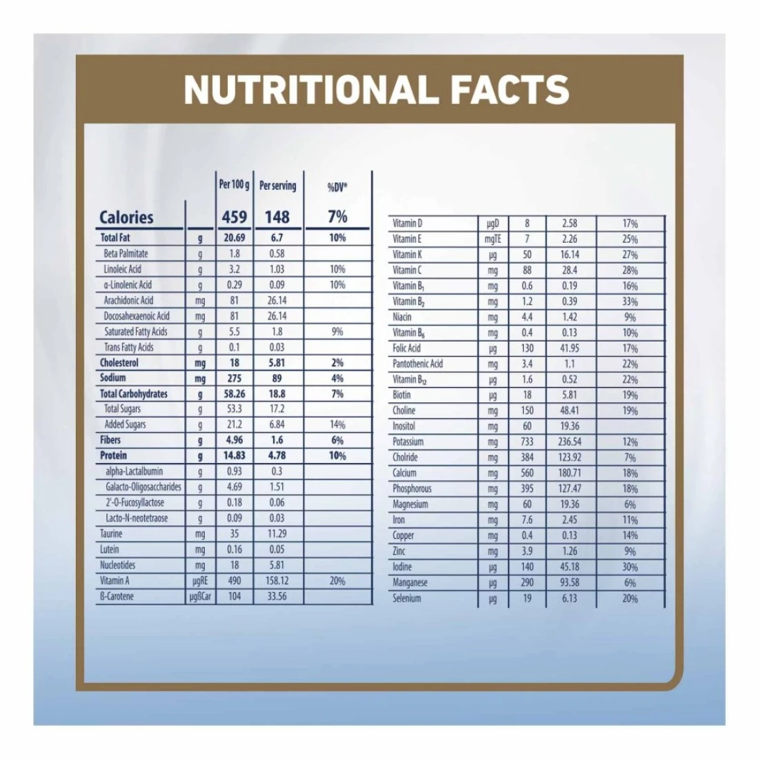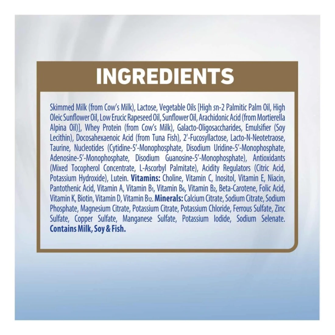 ingredients : Skimmed Milk (From Cow's Milk), Lactose, Vegetable Oils [High Sn-2 Palmitic Palm Oil, High Oleic Sunflower Oil, Low Erucic Rapeseed Oil, Sunflower Oil, Arachidonic Acid (From Tortorella Alpina Oil)], Whey Protein (From Cow's Milk), Galactic-oligosaccharides, Emulsifier (Soy Lecithin), Docosahexaenoic Acid (From Tuna Fish), 2'-fucosyllactose, Lactose-n-neo Tetras, Taurine, Nucleotides (Cytidine-5'-monophosphate, Disodium Uridine-5'-monophosphate, Adenosine-5'-monophosphate, Disodium Guanosine-5'-monophosphate, Disodium Inosine 5'-monophosphate), Antioxidants (Mixed Tocopherol Concentrate, L-ascorbyl Palmitate), Acidity Regulators (Citric Acid, Potassium Hydroxide), Lutein. Vitamins: Choline, Vitamin C, Inositol, Vitamin E, Niacin, Pantothenic Acid, Vitamin A, Vitamin B1, Vitamin B6, Vitamin B2, Beta-carotene, Folic Acid, Vitamin K, Biotin, Vitamin D, Vitamin B12. Minerals: Calcium Citrate, Sodium Citrate, Sodium Phosphate, Magnesium Citrate, Potassium Citrate, Potassium Chloride, Ferrous Sulfate, Zinc Sulfate, Copper Sulfate, Manganese Sulfate, Potassium Iodide, Sodium Selenate