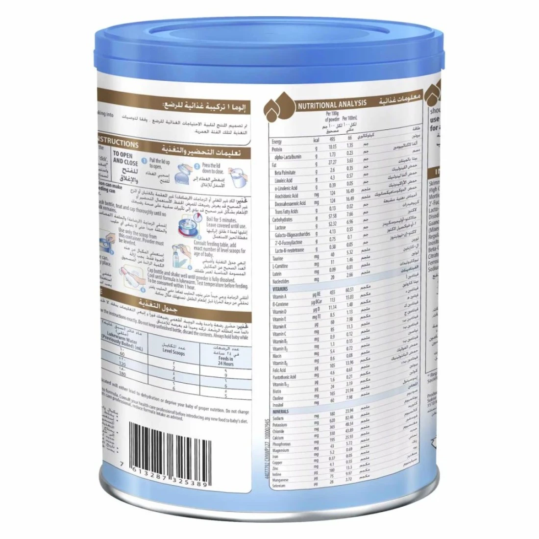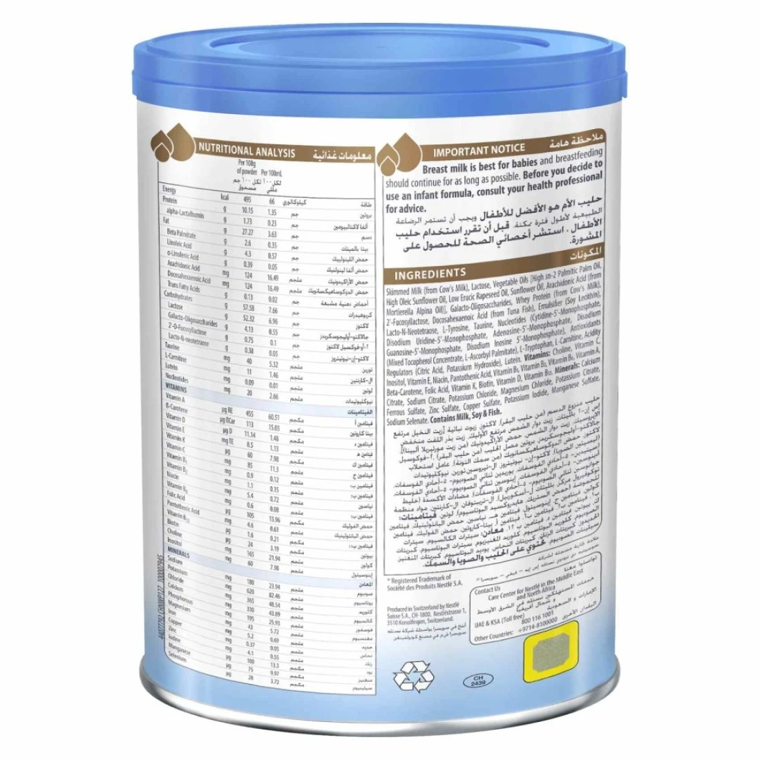 ingredients : Skimmed Milk (From Cow's Milk), Lactose, Vegetable Oils [High Sn-2 Palmitic Palm Oil, High Oleic Sunflower Oil, Low Erucic Rapeseed Oil, Sunflower Oil, Arachidonic Acid (From Tortorella Alpina Oil)), Galactose-oligosaccharides, Whey Protein (From Cow's Milk), 2'-fucosyllactose, Docosahexaenoic Acid (From Tuna Fish), Emulsifier (Soy Lecithin), Lactose-n-neo Petra's, L-tyrosine, Taurine, Nucleotides (Cytidine-5'-monophosphate, Disodium Uridine-5-monophosphate, Adenosine-5-monophosphate, Disodium Guanosine-5-monophosphate, Disodium Inosine 5'-monophosphate), Antioxidants (Mixed Tocopherol Concentrate, L-ascorbyl Palmitate), L-tryptophan, L-cami Tine, Acidity Regulators (Citric Acid, Potassium Hydroxide), Lutein. Vitamins: Choline, Vitamin C, Inositol, Vitamin E, Niacin, Pantothenic Acid, Vitamin B1, Vitamin B2, Vitamin B6, Vitamin A, Beta-carotene, Folic Acid, Vitamin K, Biotin, Vitamin D, Vitamin B12. Minerals: Calcium Citrate, Sodium Citrate, Potassium Chloride, Magnesium Chloride, Potassium Citrate, Ferrous Sulfate, Zinc Sulfate, Copper Sulfate, Potassium Iodide, Manganese Sulfate, Sodium Selenate