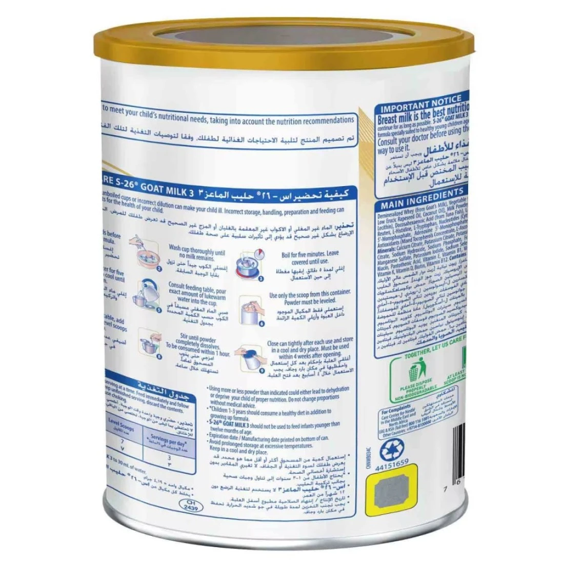 S-26 Stage 3 Goat Milk Baby Formula is a specially formulated infant formula made from goat's milk for babies aged 1 to 3 years old. It provides essential nutrients to support healthy growth and development during this critical stage. This formula contains DHA, which is important for brain and eye development, as well as iron, calcium, and other vitamins and minerals. It is also easy to digest and suitable for children with cow's milk protein sensitivity. With 's expertise in infant nutrition, you can trust that S-26 Stage 3 Goat Milk Baby Formula provides the nourishment your growing child needs.
