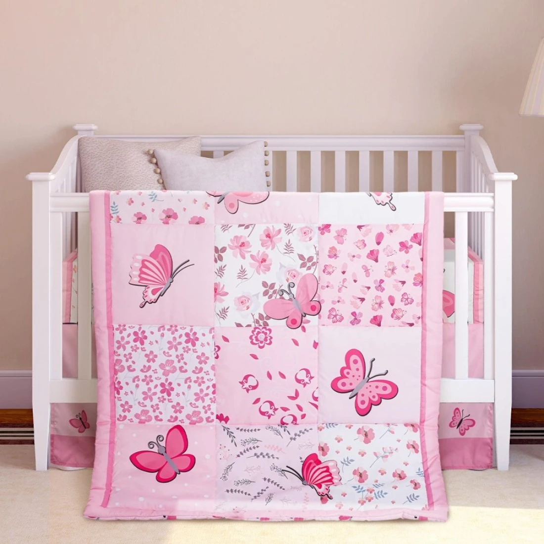 You Will Get: the package comes with 3 pieces of butterfly crib bedding set, including 1 piece of baby comforter in 45 x 36 inch/ 114 x 91 cm, 1 piece of fitted sheet in 52 x 28 inch/ 132 x 70 cm, with a 8 inch deep pocket, 1 piece of crib skirt in 27 x 51 inch/ 68.5 x 129.5 cm, with a 15 inch drop, ample quantity can meet your using needs, Butterfly and Flower Design: the baby girl crib bedding is designed with butterflies and flowers, paired with mainly pink color, exquisite and adorable, suitable for baby girls; The patchwork quilt will add a nice addition to your baby crib, Nicely Fit: the fitted crib sheet is equipped with elastic straps, which can ensure a snug fit for the mattress, not easy to shift, Comfy Material: the crib comforter is made of polyester microfiber, and the baby fitted crib sheet and bed skirt is made of polyester, owning soft and comfortable material, friendly to baby's delicate skin, offering your baby a good sleeping quality, Delicate Gifts: the baby girl nursery bedding sets can be applied as exquisite gifts given to baby girls on baby shower, baby registry, baby birthday, and other occasions