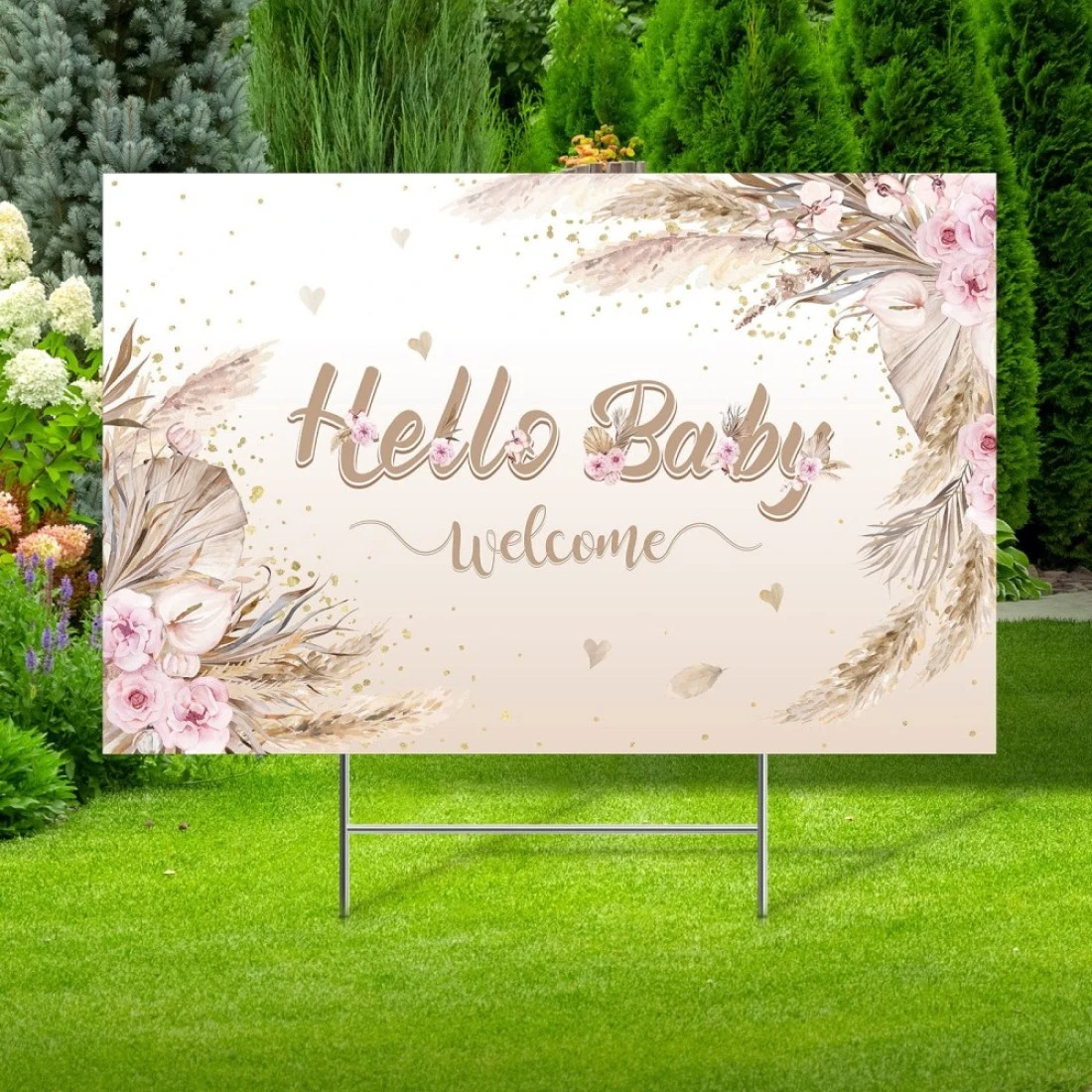 Cute Design: our baby shower yard sign with plastic stake is beautifully designed and looks so cute, featuring gold color, and flowers, leaves, printed with words such as [Hello Baby], [welcome], the boho baby shower yard sign is ideal choice for announcing the arrival of a newborn, Proper Size to Display: each package includes 1 piece hello baby lawn sign, 1 piece plastic H shaped stake and 2 pieces hard fixing glues; The size of the welcome baby yard sign is 41 x 63 cm/ 16.2 x 24.8 inches, ideal size to display in the front yard, make your yard look different and catch people's attention easily, Easy to Use: with no complicated steps, this baby shower lawn sign is very easy to install, they are not heavy, so you can simply insert and press into the ground firmly to display, save your time and energy, and you can easily change the area placed, create a happy and cute atmosphere, Weatherproof and Reusable: the gender reveal yard sign is made of quality plastic, long lasting and weatherproof, ideal for outdoor use; With professional printing, not easy to fade, reusable and waterproof, can be applied for next time if you want, Ideal for Newborn: yard sign is good for gender reveal, baby shower, pregnancy celebration, newborn party, theme party, to celebrate your joyous, suitable for lawn, yard, garden