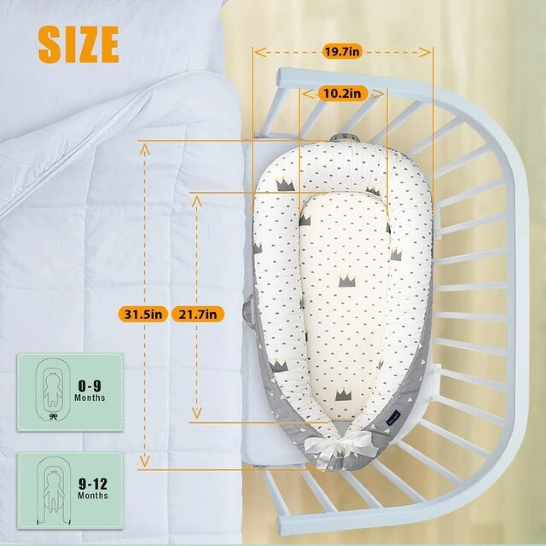 • Babies snuggle nest sleeper is 90cm long and 50cm wide. We also added extra Cushion to the base making it 4cm for optimal support