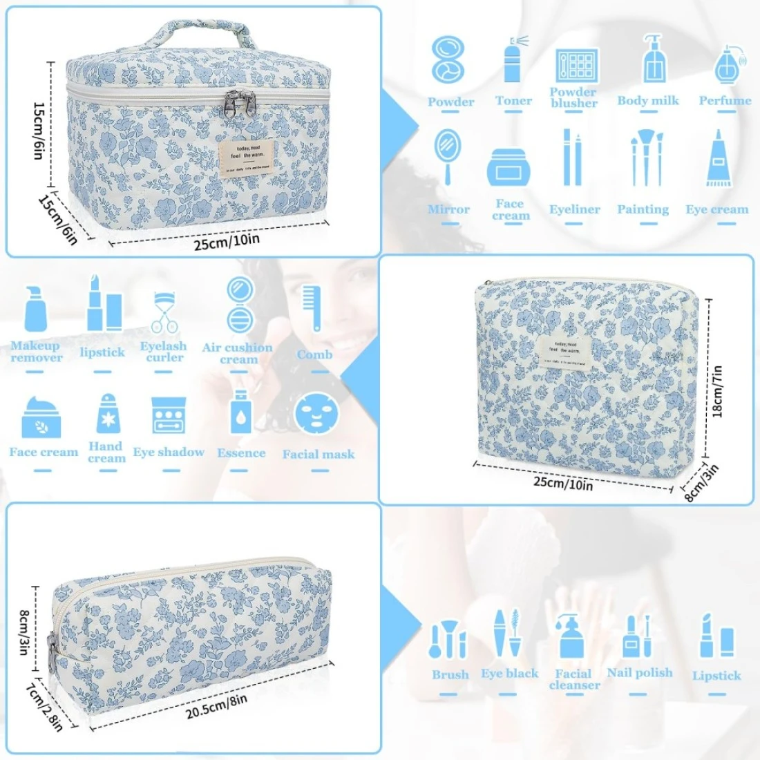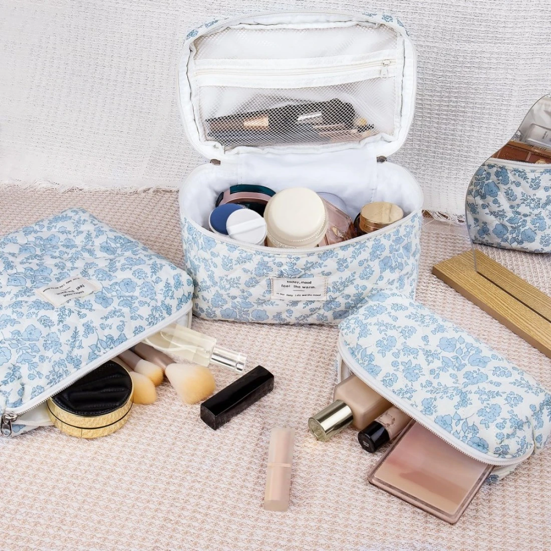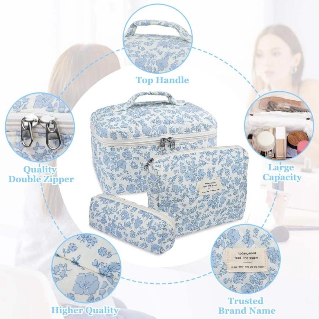 Makeup Bag Set, Quilted Makeup Bag, Large Floral Cosmetic Bag for Women, Cute Cotton Makeup Bags, Flower Travel Toiletry Organizer Bag