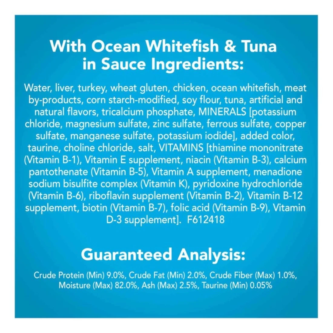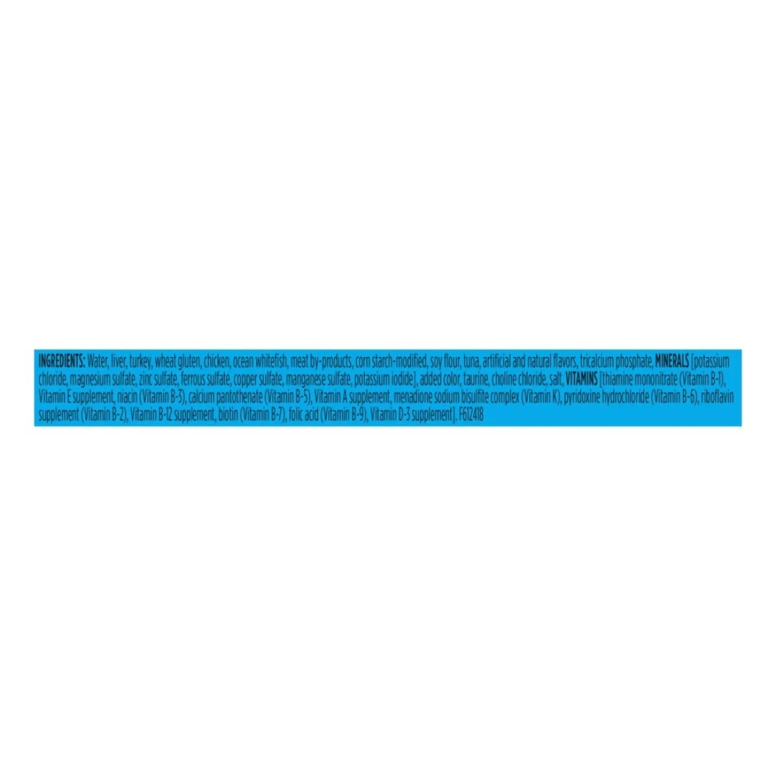 ingredients : Whitefish and Sardines In Sauce: Water, Liver, Turkey, Wheat Gluten, Chicken, Meat By-Products, Corn Starch-Modified, Soy Flour, Ocean Whitefish, Sardines, Artificial and Natural Flavours, Tricalcium Phosphate, Added Colour, Minerals [Potassium Chloride, Zinc Sulphate, Ferrous Sulphate, Manganese Sulphate, Copper Sulphate, Potassium Iodide], Taurine, Salt, Choline Chloride, Vitamins [Thiamine Mononitrate (Vitamin B-1), Vitamin E Supplement, Niacin (Vitamin B-3), Calcium Pantothenate (Vitamin B-5), Vitamin A Supplement, Menadione Sodium Bisulfite Complex (Vitamin K), Pyridoxine Hydrochloride (Vitamin B-6), Riboflavin Supplement (Vitamin B-2), Vitamin B-12 Supplement, Biotin (Vitamin B-7), Folic Acid (Vitamin B-9), Vitamin D-3 Supplement], Xanthan Gum