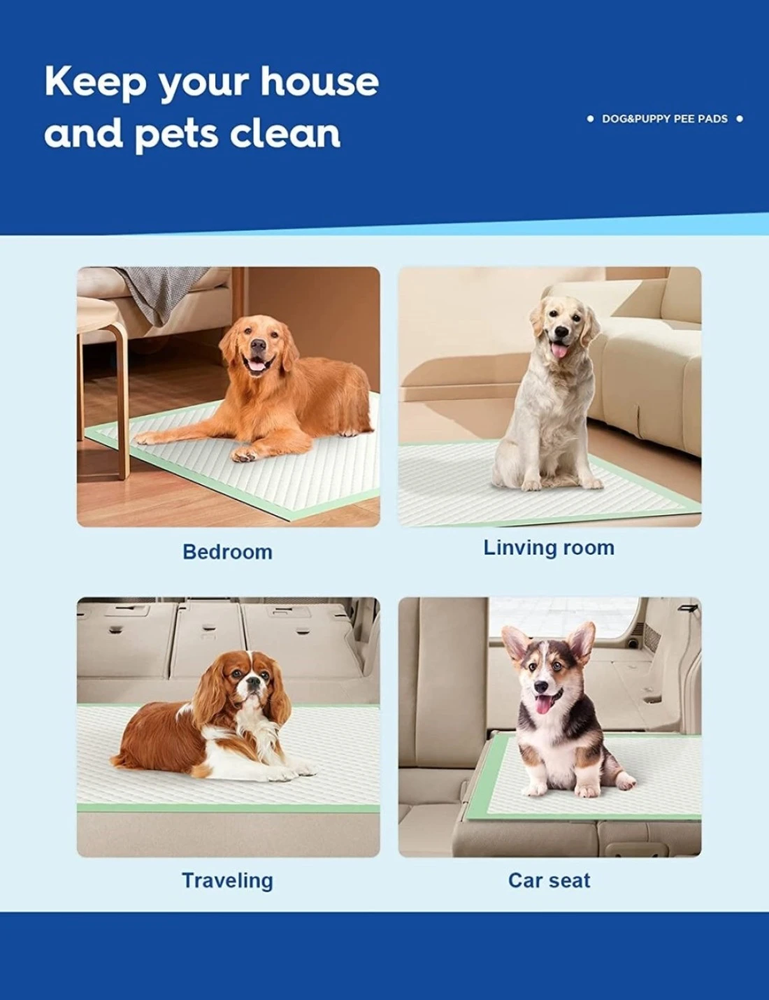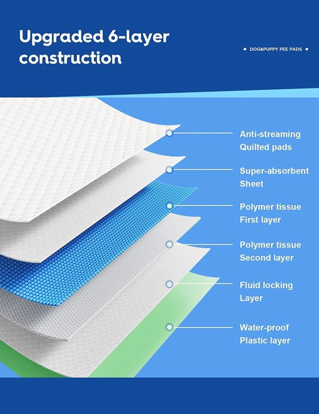 【Super Absorbent & Quick Drying】6-layer protection design makes our thickened regular and large dog training pads are much more absorbent than most wee wee pee pads for dogs on the market. The dog potty training pad uses new premium material perforated film as the top layer of the puppy pad which can speed up the liquid to pass through the surface than common non-woven fabric and keep the surface quick-drying, comfortable, no puddling, and no tracking.