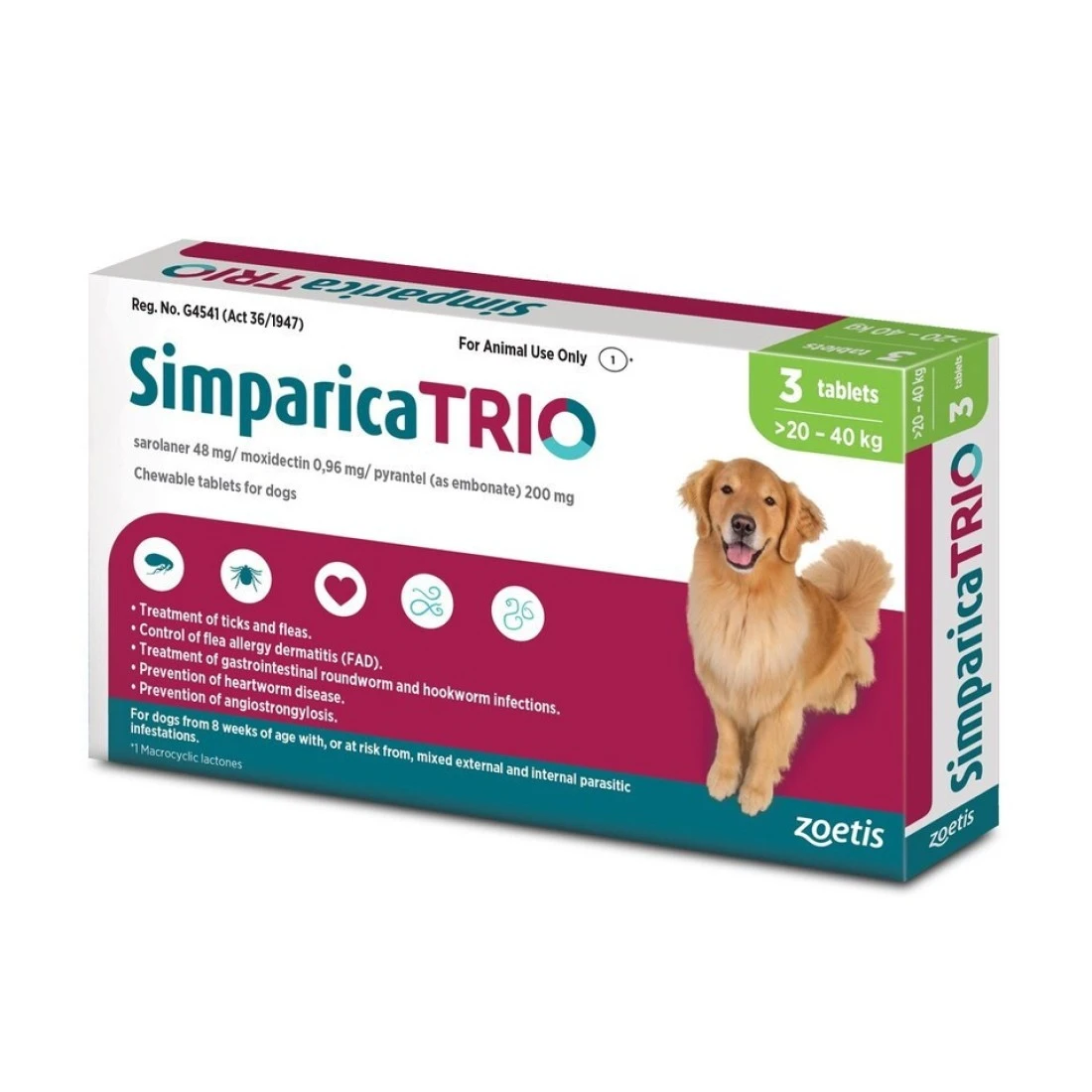 Zoetis Simparica TRIO the Complete Flea, Tick, and Heartworm Prevention for Dogs 20-40 kg ( 3 Chewable Tablets)