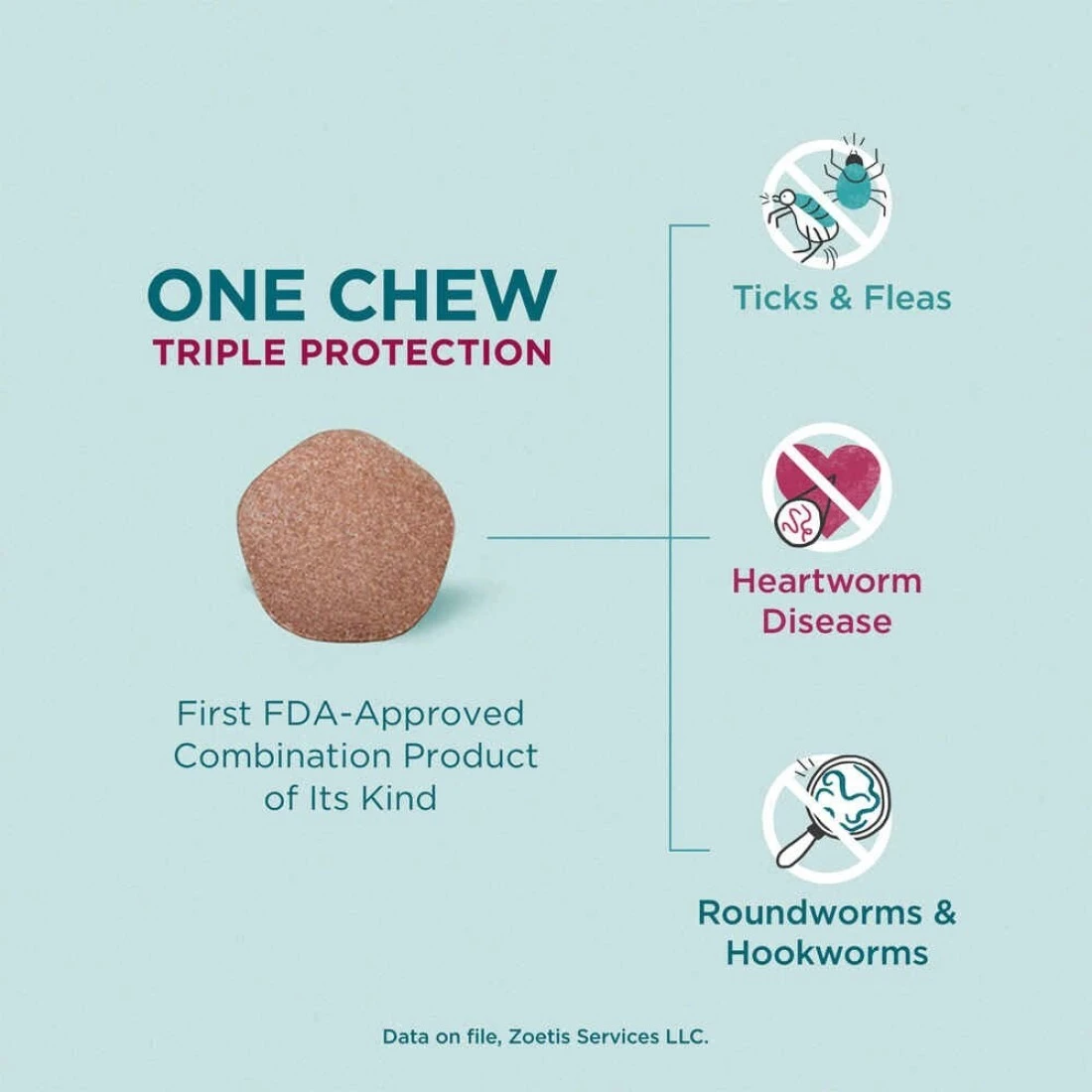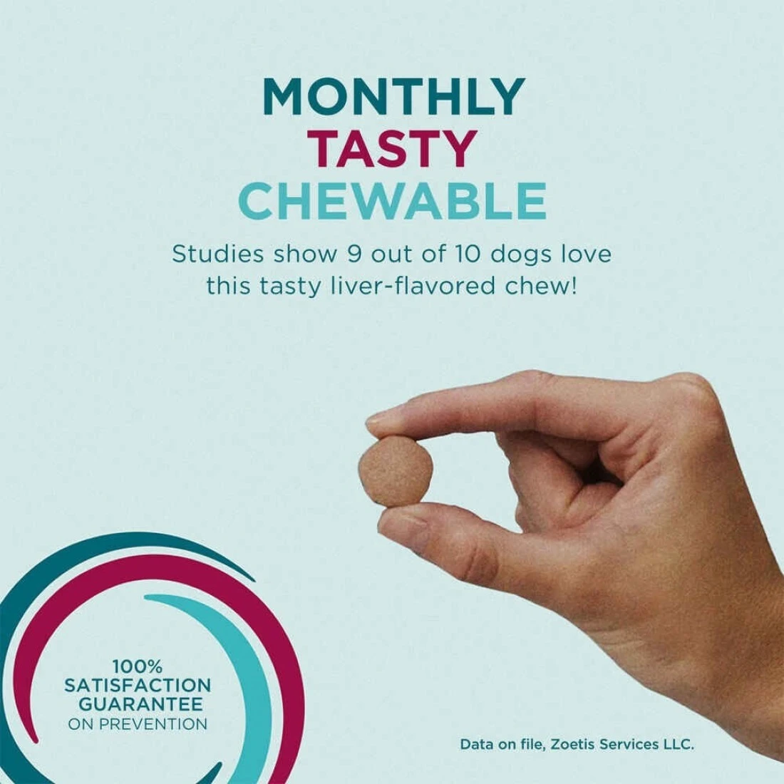 < /b >Starts eliminating fleas within 4 hours and paralysis ticks within 24 hours.< /b >Provides effective protection against deadly heartworm disease.< /b >Targets and eliminates roundworms and hookworms, ensuring your dog stays healthy.< /b >A simple, once-a-month chew that dogs love.< /b >Additional treatment required for tapeworm protection.< /b >