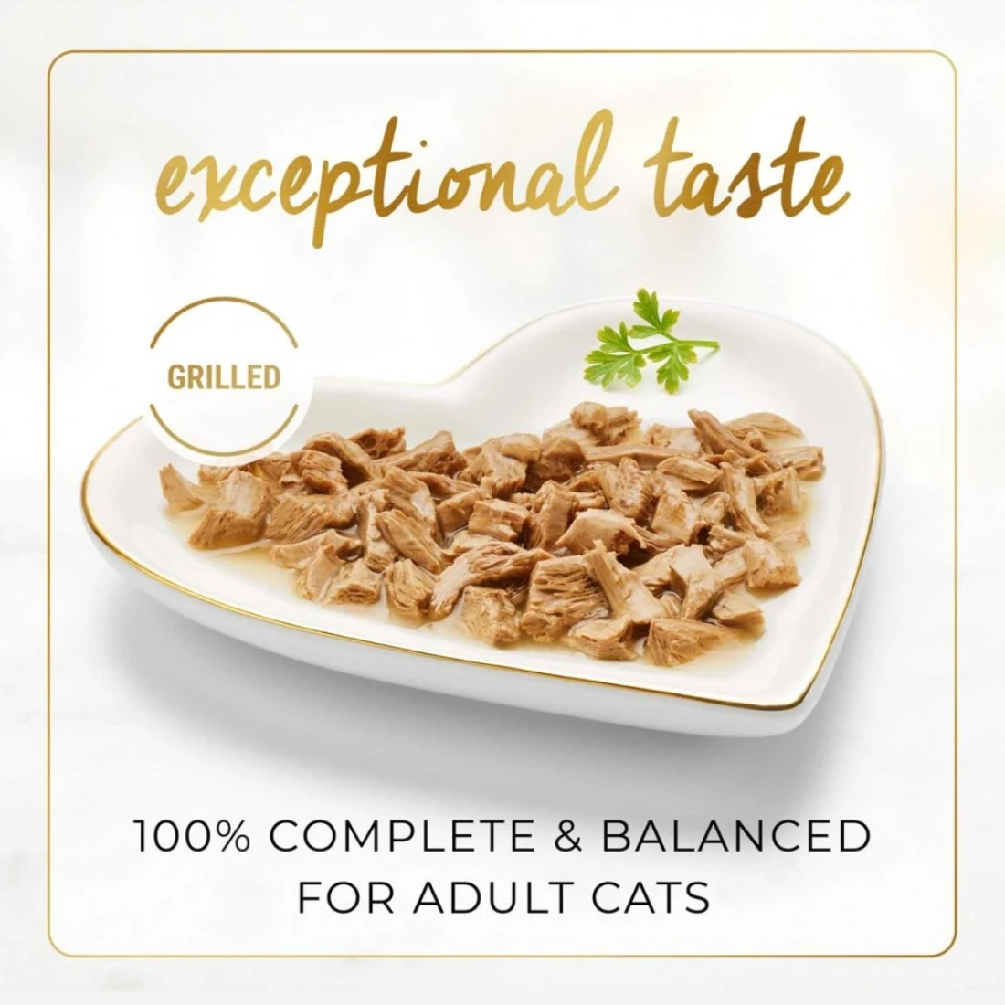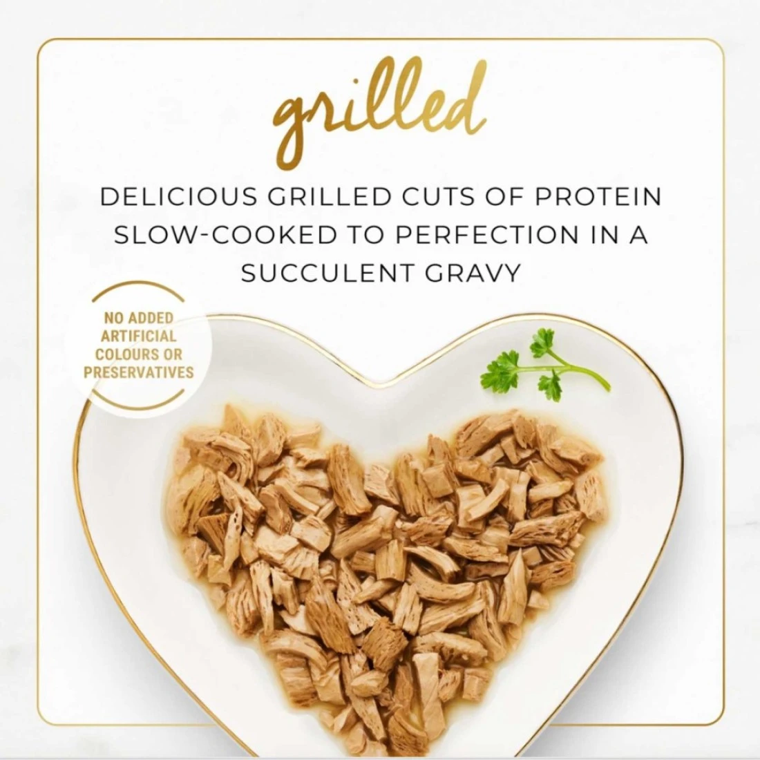 - High-quality grilled chicken in a savoury sauce, providing a delicious meal for your feline friend