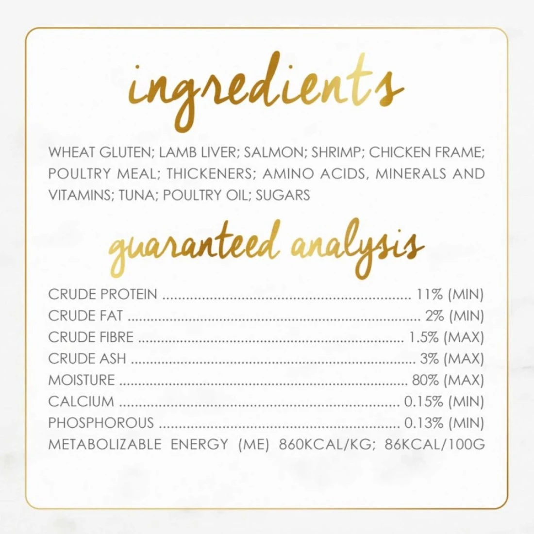 ingredients : Chicken Frame, Wheat Gluten, Lamb Liver, Poultry Meal, Thickeners, Amino Acids, Minerals and Vitamins, Tuna, Poultry Oil, Sugars