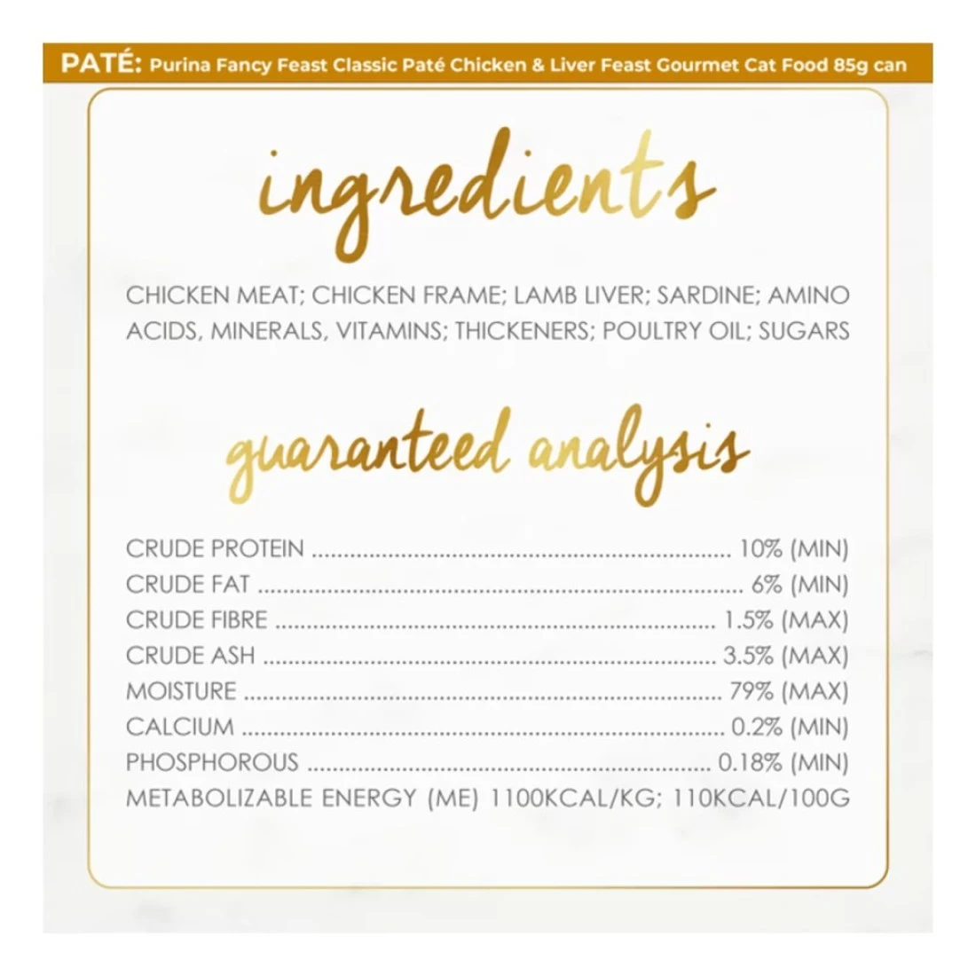 ingredients : Chicken Meat, Chicken Frame, Lamb Liver, Sardine, Amino Acids, Minerals, Vitamins, Thickeners, Poultry Oil, Sugars