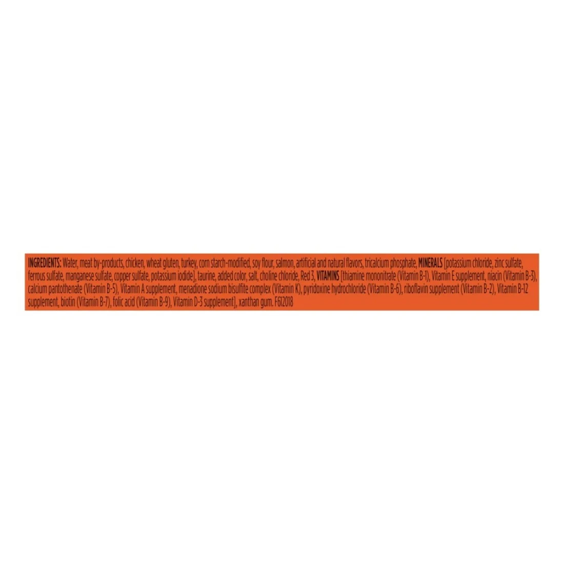 ingredients : Water Sufficient For Processing, Meat By-Products, Turkey, Wheat Gluten, Chicken, Corn Starch-Modified, Soy Flour, Artificial and Natural Flavours, Cheese, Calcium Phosphate, Soybean Oil, Potassium Chloride, Dried Egg Product, Taurine, Salt, Added Colour, Whey, Sodium Caseinate, Choline Chloride, Sodium Tripolyphosphate, Thiamine Mononitrate, Vitamin E Supplement, Zinc Sulphate, Ferrous Sulphate, Sorbic Acid (A Preservative), Carrageenan, Niacin, Calcium Pantothenate, Copper Sulphate, Vitamin A Supplement, Manganese Sulphate, Menadione Sodium Bisulphite Complex (Source of Vitamin K Activity), Pyridoxine Hydrochloride, Riboflavin Supplement, Vitamin B-12 Supplement, Biotin, Folic Acid, Vitamin D-3 Supplement, Potassium Iodide