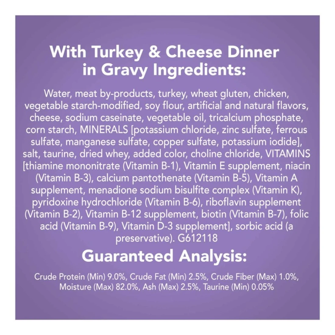 ingredients : Water Sufficient For Processing, Meat By-Products, Turkey, Wheat Gluten, Chicken, Corn Starch-Modified, Soy Flour, Artificial and Natural Flavours, Cheese, Calcium Phosphate, Soybean Oil, Potassium Chloride, Dried Egg Product, Taurine, Salt, Added Colour, Whey, Sodium Caseinate, Choline Chloride, Sodium Tripolyphosphate, Thiamine Mononitrate, Vitamin E Supplement, Zinc Sulphate, Ferrous Sulphate, Sorbic Acid (A Preservative), Carrageenan, Niacin, Calcium Pantothenate, Copper Sulphate, Vitamin A Supplement, Manganese Sulphate, Menadione Sodium Bisulphite Complex (Source of Vitamin K Activity), Pyridoxine Hydrochloride, Riboflavin Supplement, Vitamin B-12 Supplement, Biotin, Folic Acid, Vitamin D-3 Supplement, Potassium Iodide