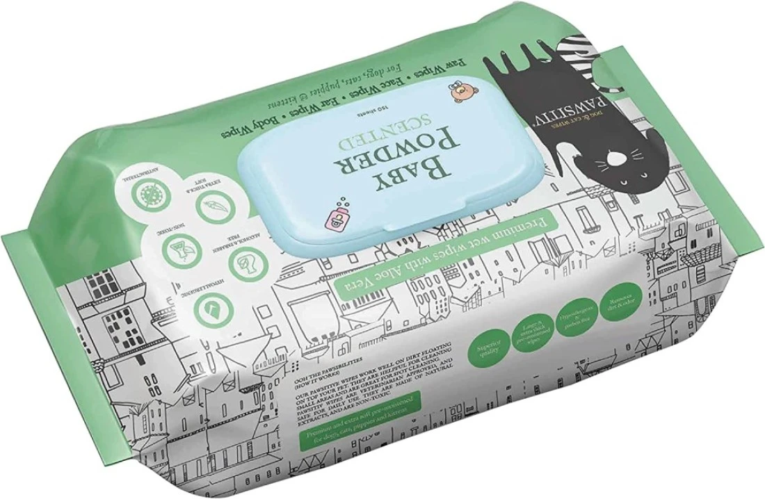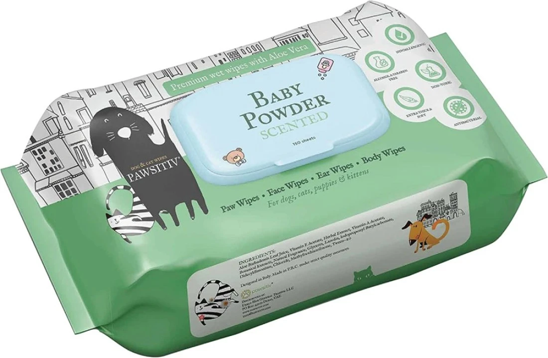Pawsitiv Grooming Pet Wipes with Aloe Vera for Dogs, Puppies, Cats and Kittens - Hypoallergenic, Paraben and Alcohol Free - 150sheets - Baby Powder Scent