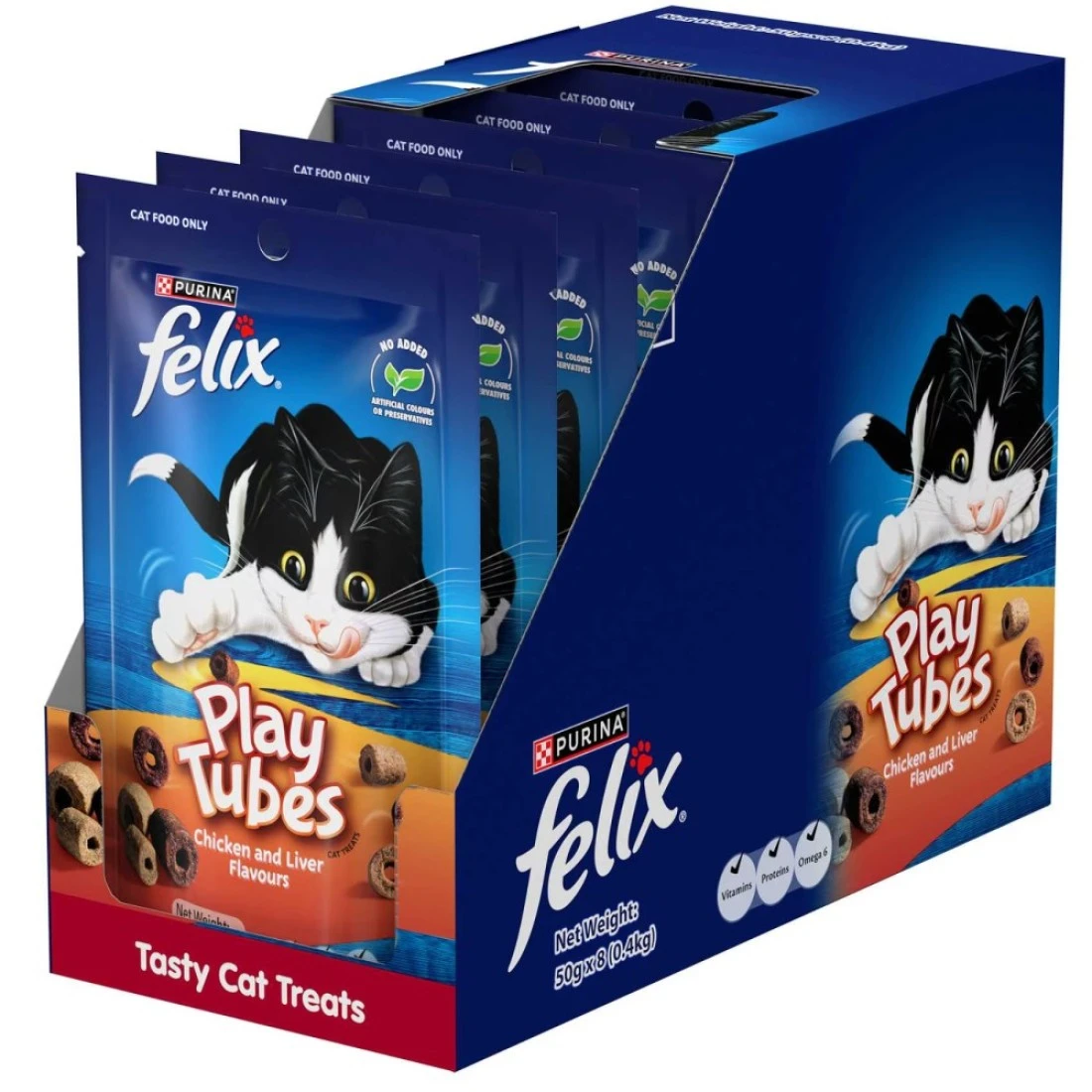Purina Felix Play Tubes Chicken and Liver Flavours Dry Cat Treats, 50g Pack of 8