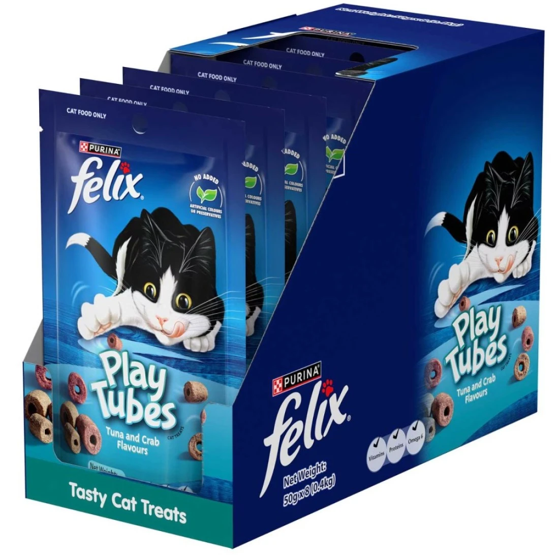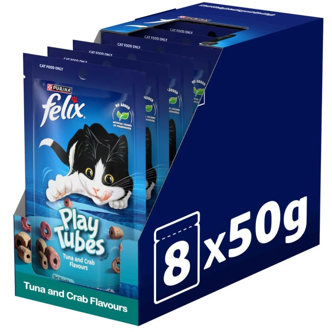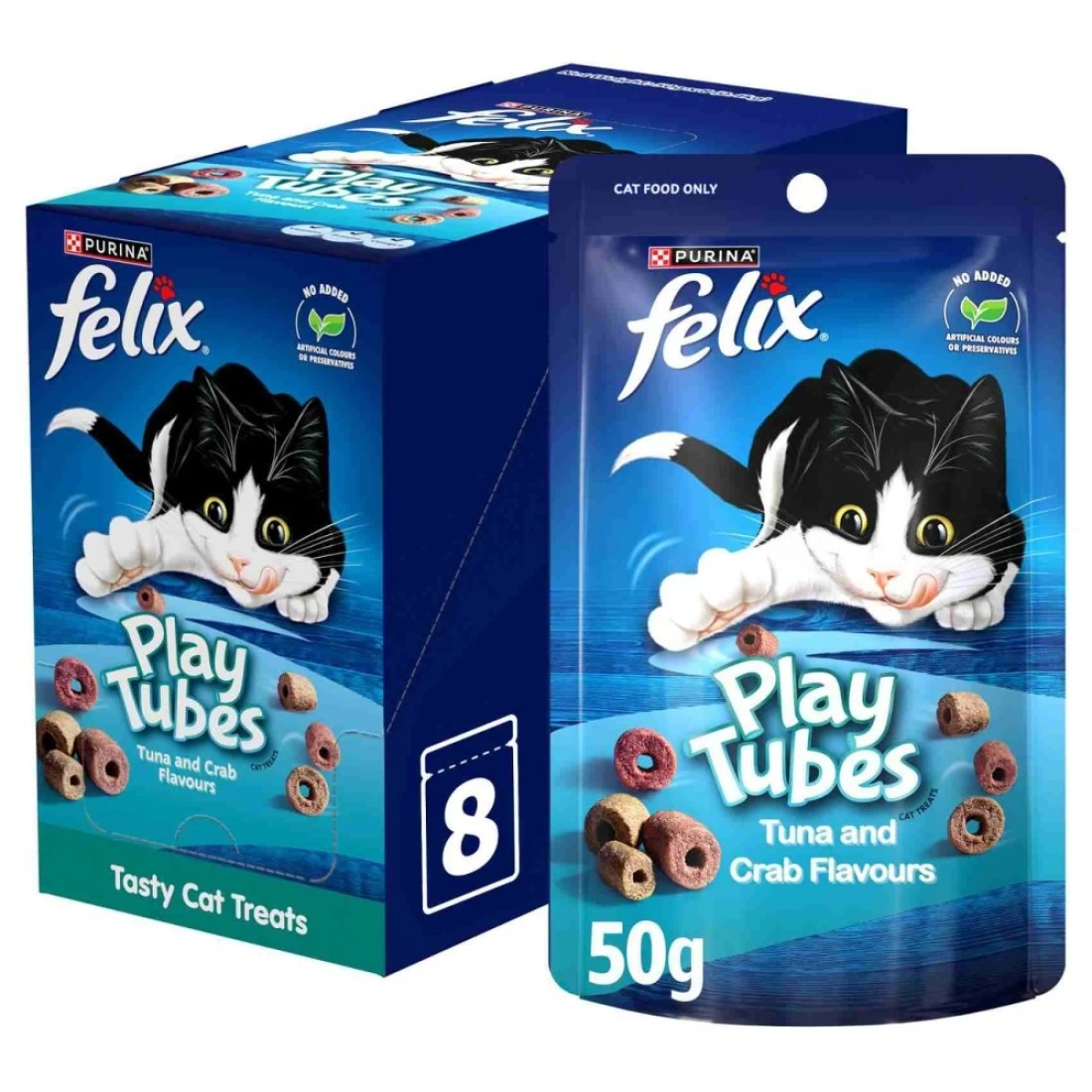 Purina Felix Play Tubes Tuna and Crab Flavours Dry Cat Treats, 50g Pack of 8