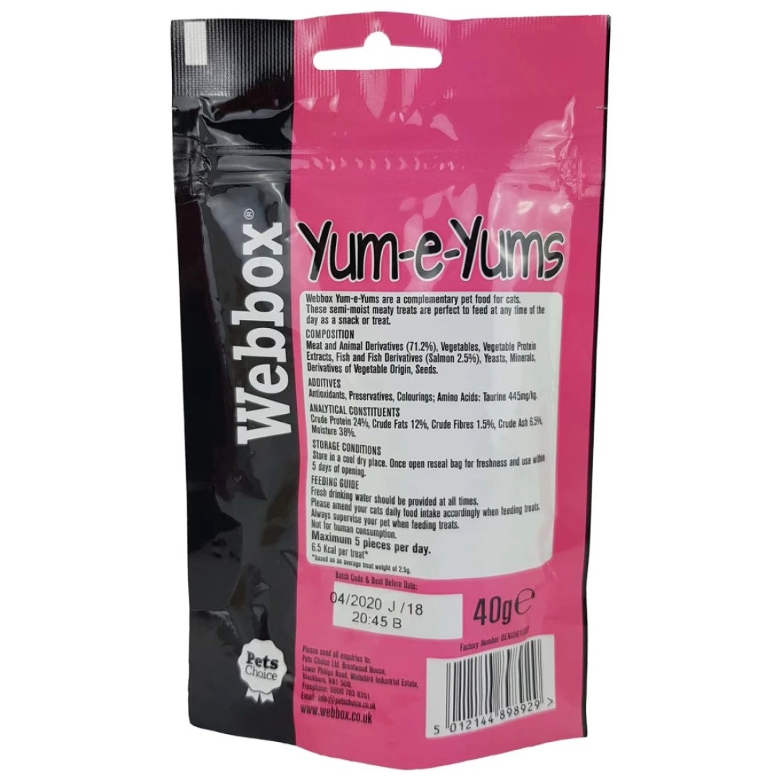 Webbox Yum-E-Yums Salmon Cat Treats are delicious and nutritious treats for your feline friend. Made with real salmon these treats are packed with high-quality protein to support your cat's overall health and wellbeing. They are also enriched with essential vitamins and minerals to help maintain a healthy immune system and promote a shiny coat and healthy skin. These treats are small in size and have a crunchy texture making them perfect for training rewarding or simply as a tasty snack. The resealable pack ensures that the treats stay fresh and the 40g size is perfect for on-the-go or travel. Treat your cat to the irresistible taste of Webbox Yum-E-Yums Salmon Cat Treats!
