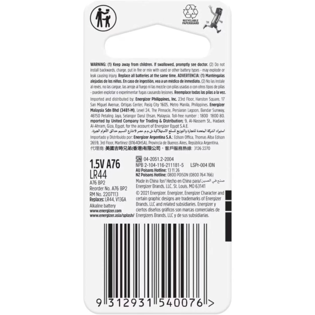 - 2-pack of Energizer A76 Alkaline batteries