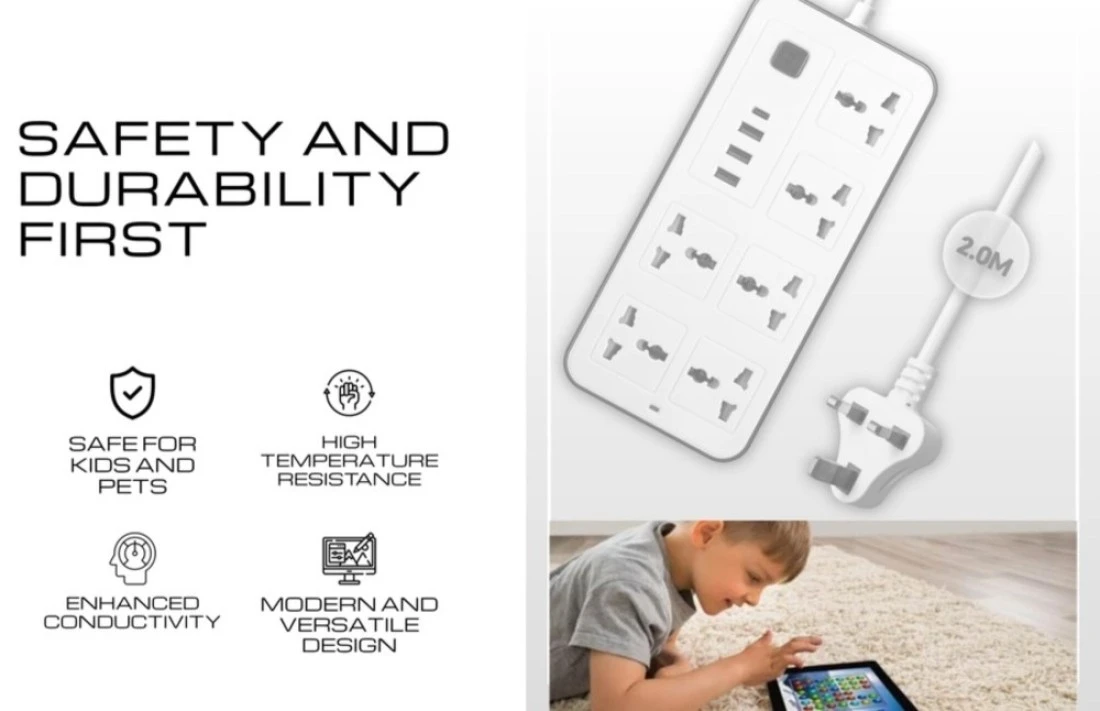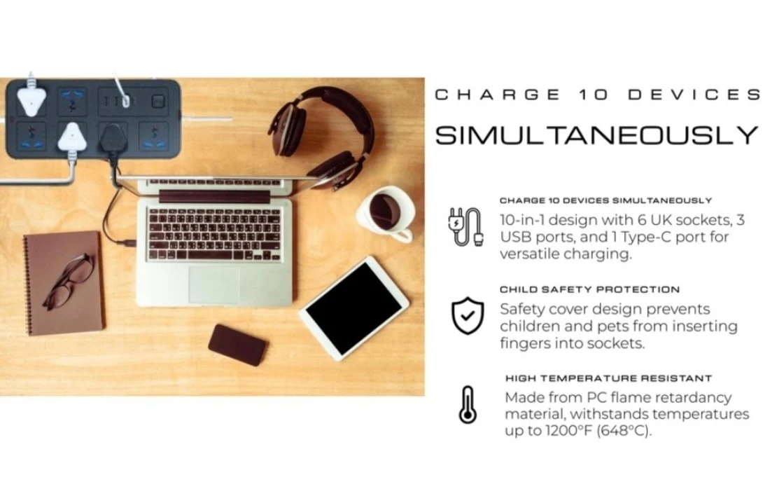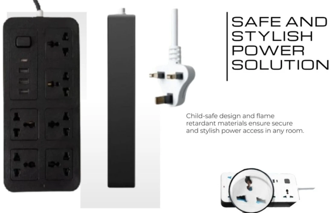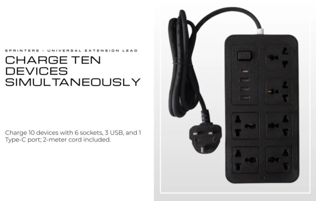Sprinters - Universal Extension Socket 2 Meter Wire 6 AC Outlets 3 USB Ports 1 USB-C Port UK Plug 3 Pin Socket Outlet Surge Protector Power Strip for Home, Office, and Electronics (Black)