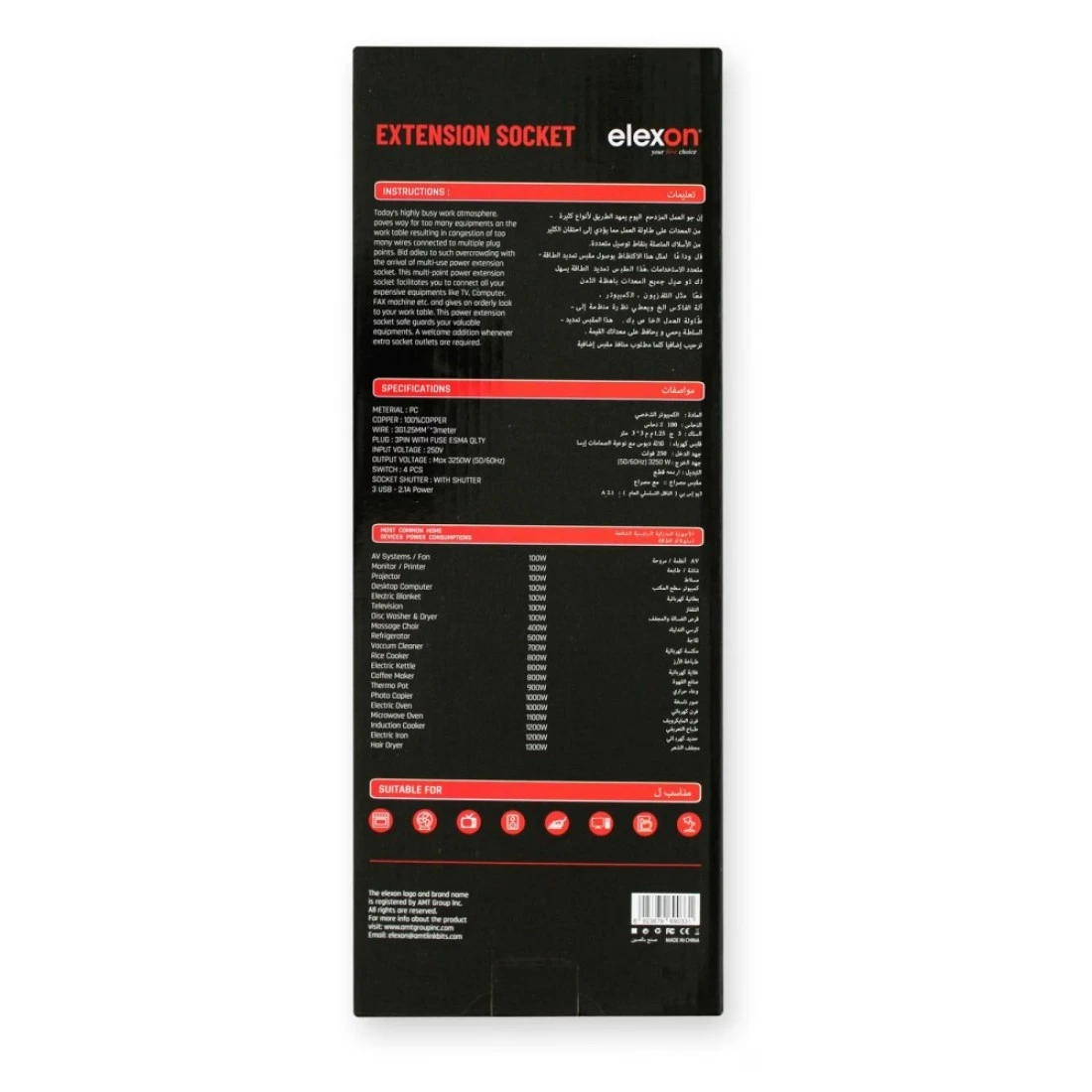 - Extension board with international sockets, suitable for all types of plugs