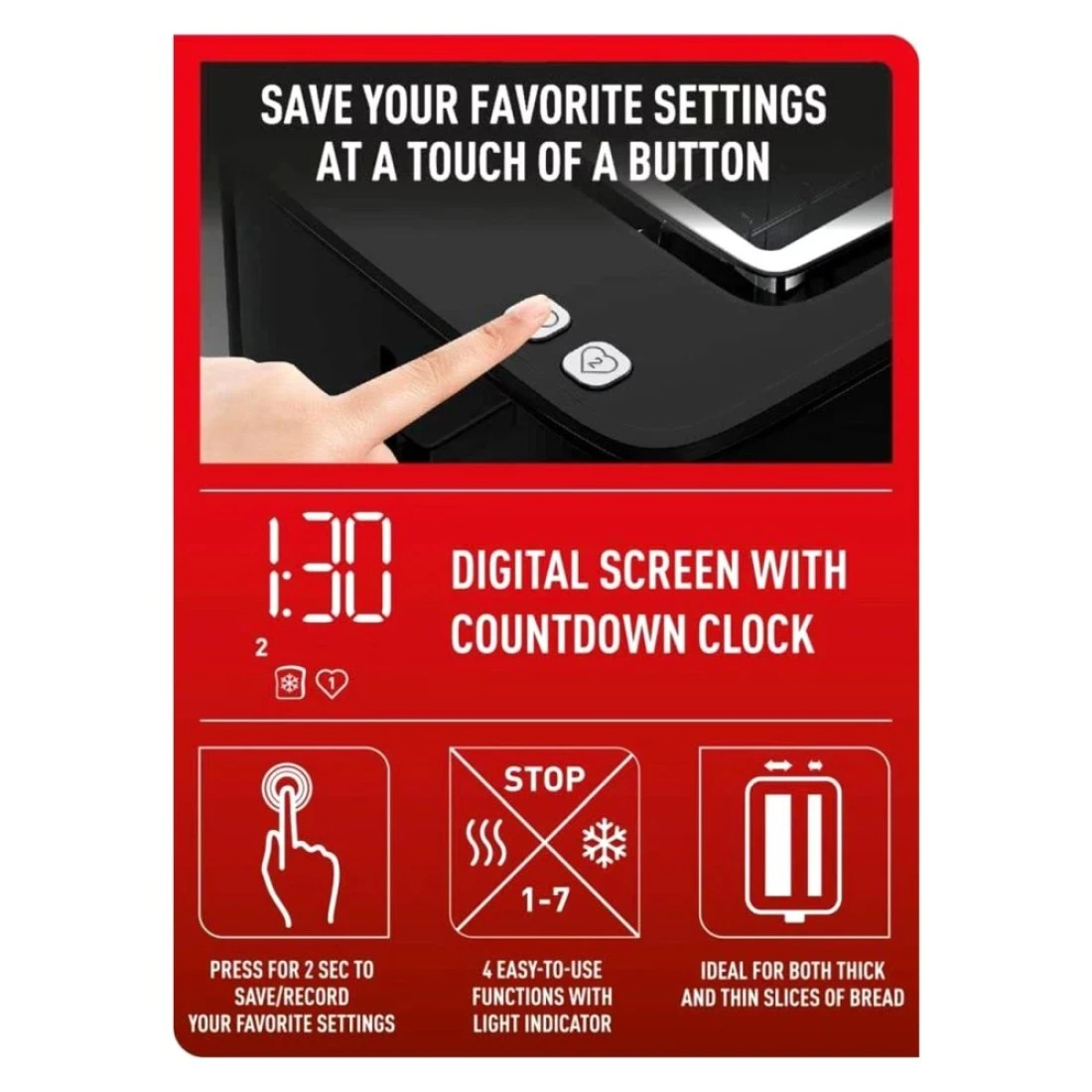 - Featuring a seamless digital screen this toaster displays the live countdown of the toasting time so that you don’t spend time waiting for it to be ready or come back too late once it is cold! It also offers a range of seven browning levels from lightly golden to extra crispy - perfect for customized results