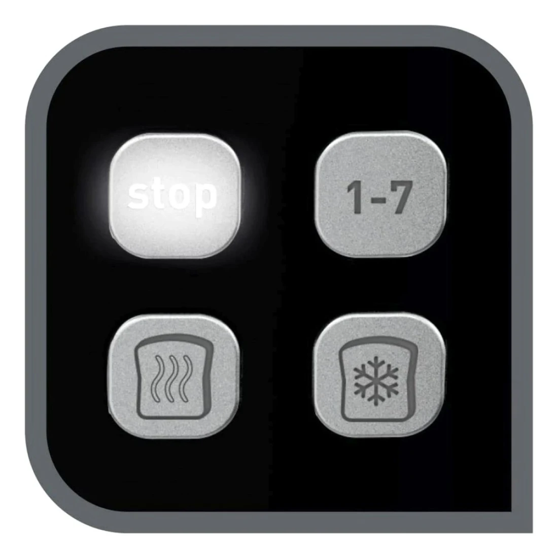 - There’s also a ‘reheat’ setting to keep your toast warm plus a stop to pop up your bread at any time during the toasting cycle and each setting illuminates when selected