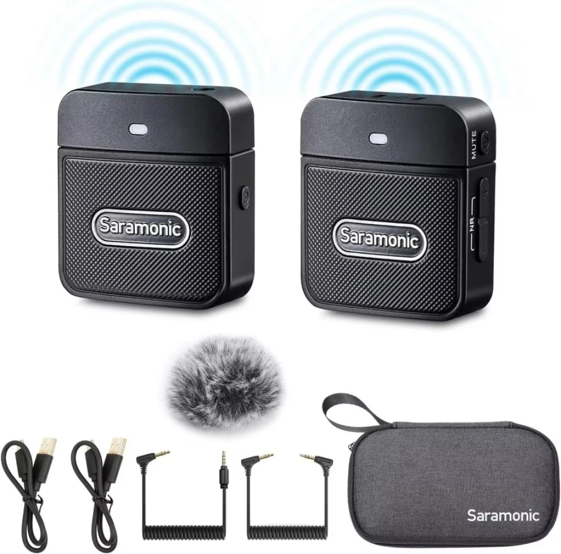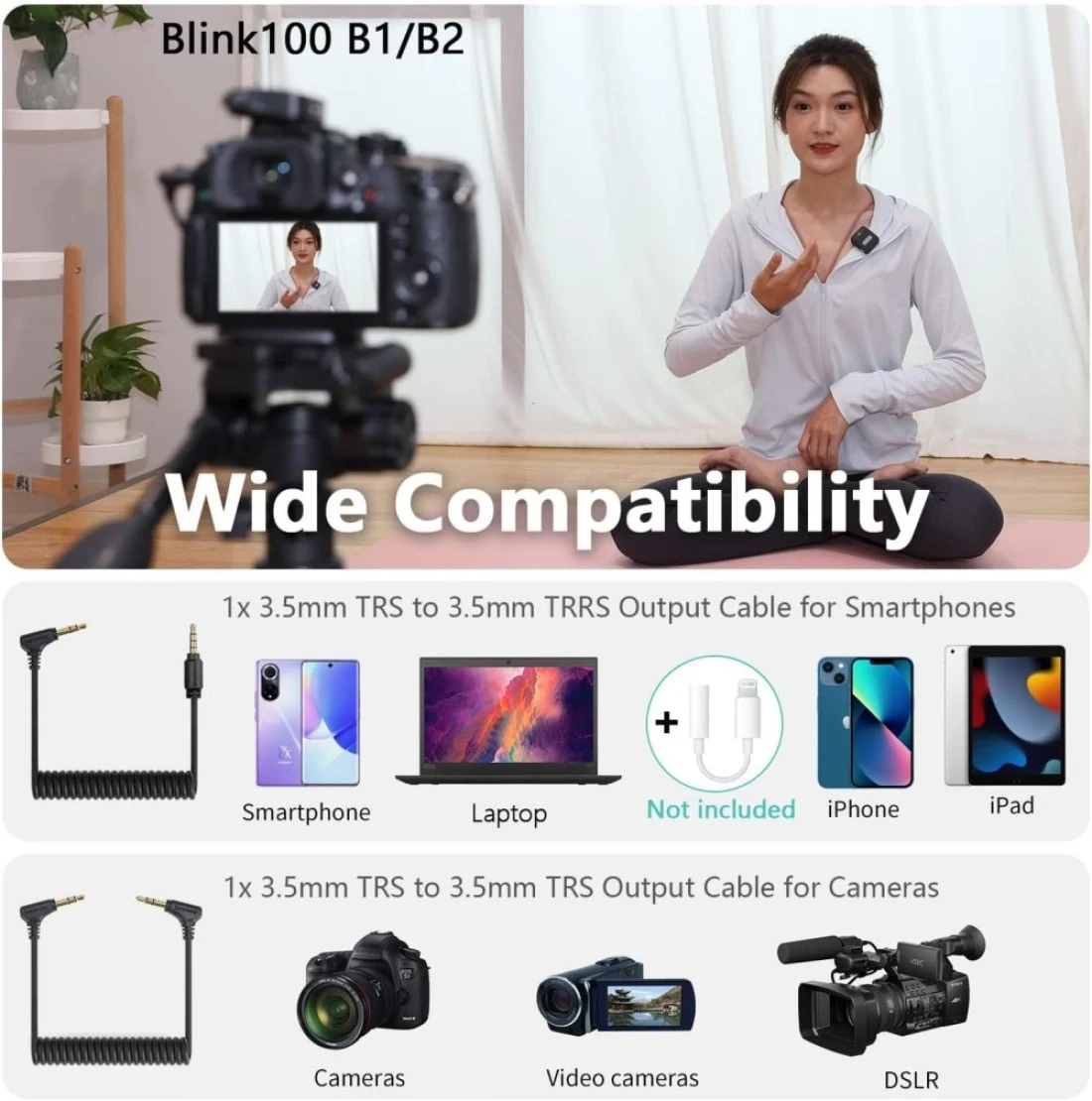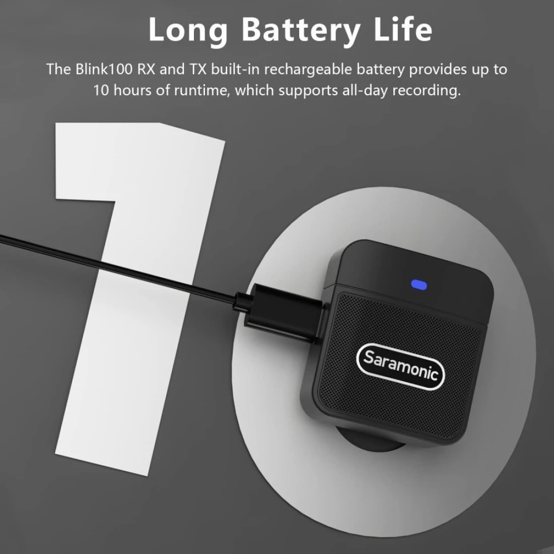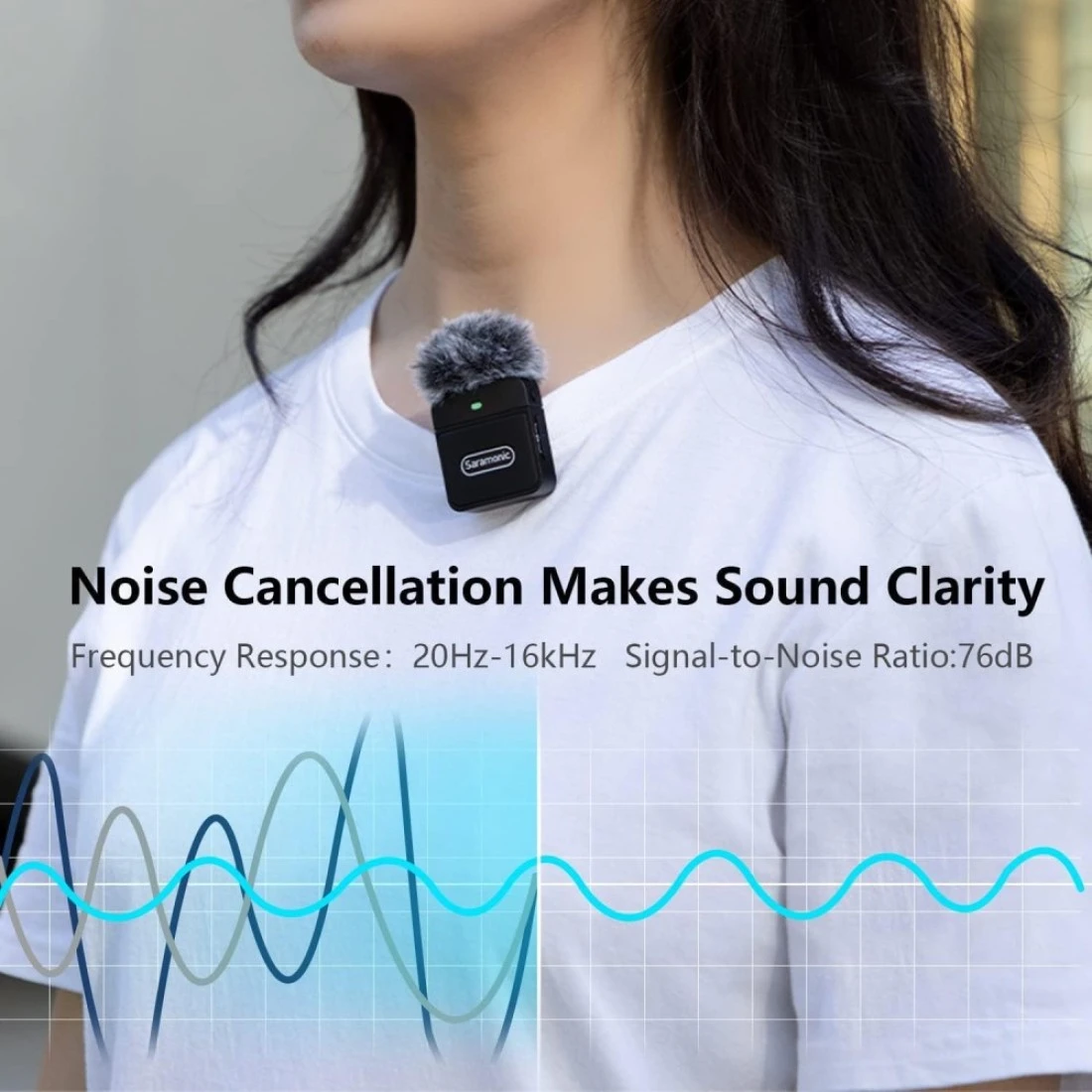 Saramonic Blink100 wireless microphone system is an ultracompact and portable 2.4GHz wireless microphone system, compatible with smartphones, tablets, DSLR cameras, camcorders, etc. The Blink100 system features automatic pairing and selectable noise cancellation, delivering broadcast-quality sound, ideal for live streaming, vlogging, mobile journalism, and more.