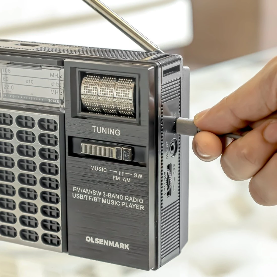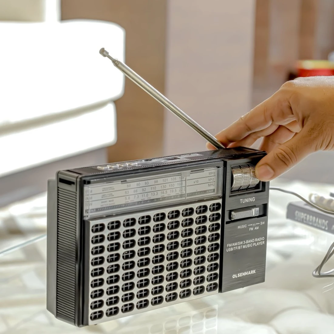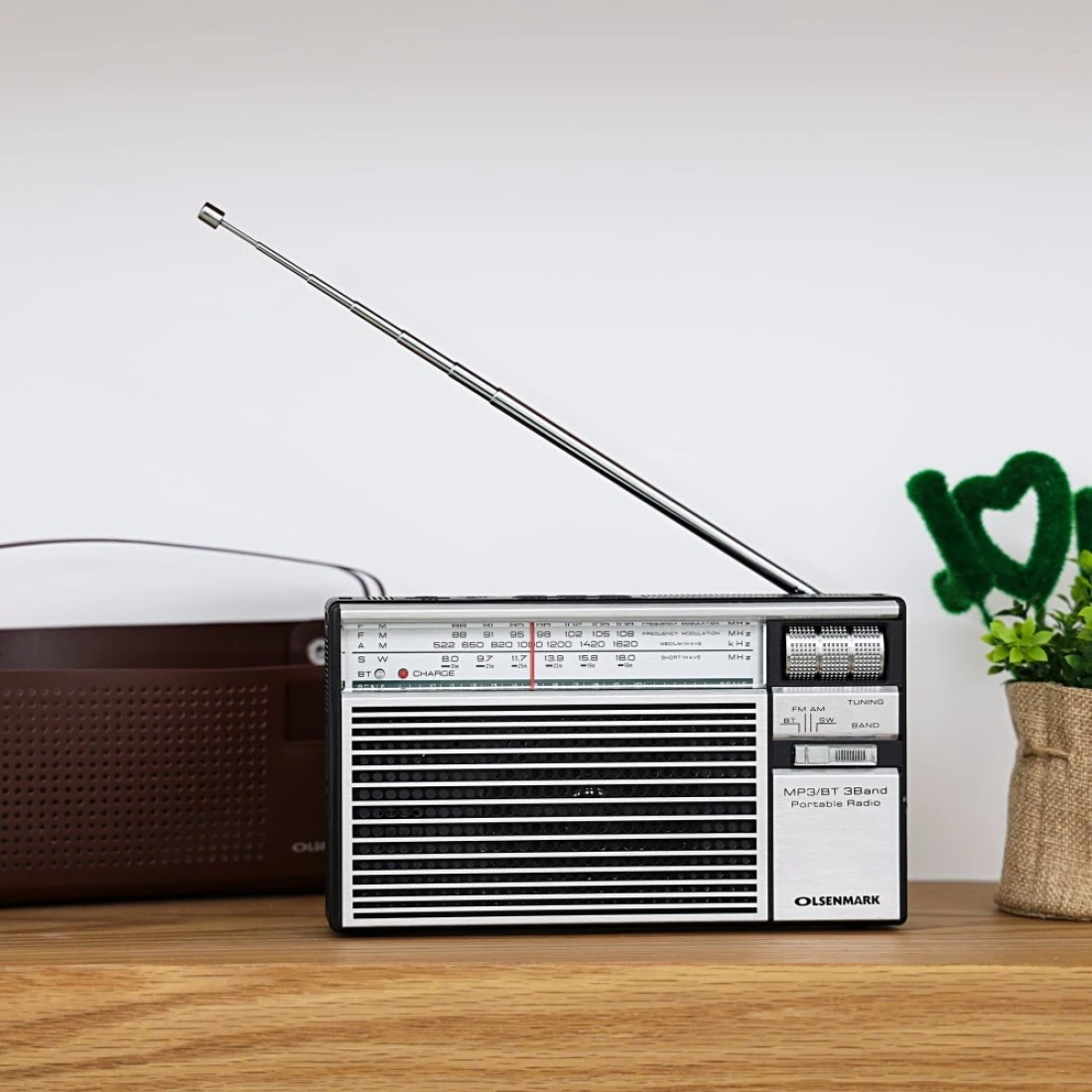 Olsenmark Portable Radio with 3 Band - Rechargeable Battery, Bluetooth USB, TF, & MP3, Comfortable Handle, Karaoke Function - Recorder - Microphone Retro Style Radio, 2 Years Warranty
