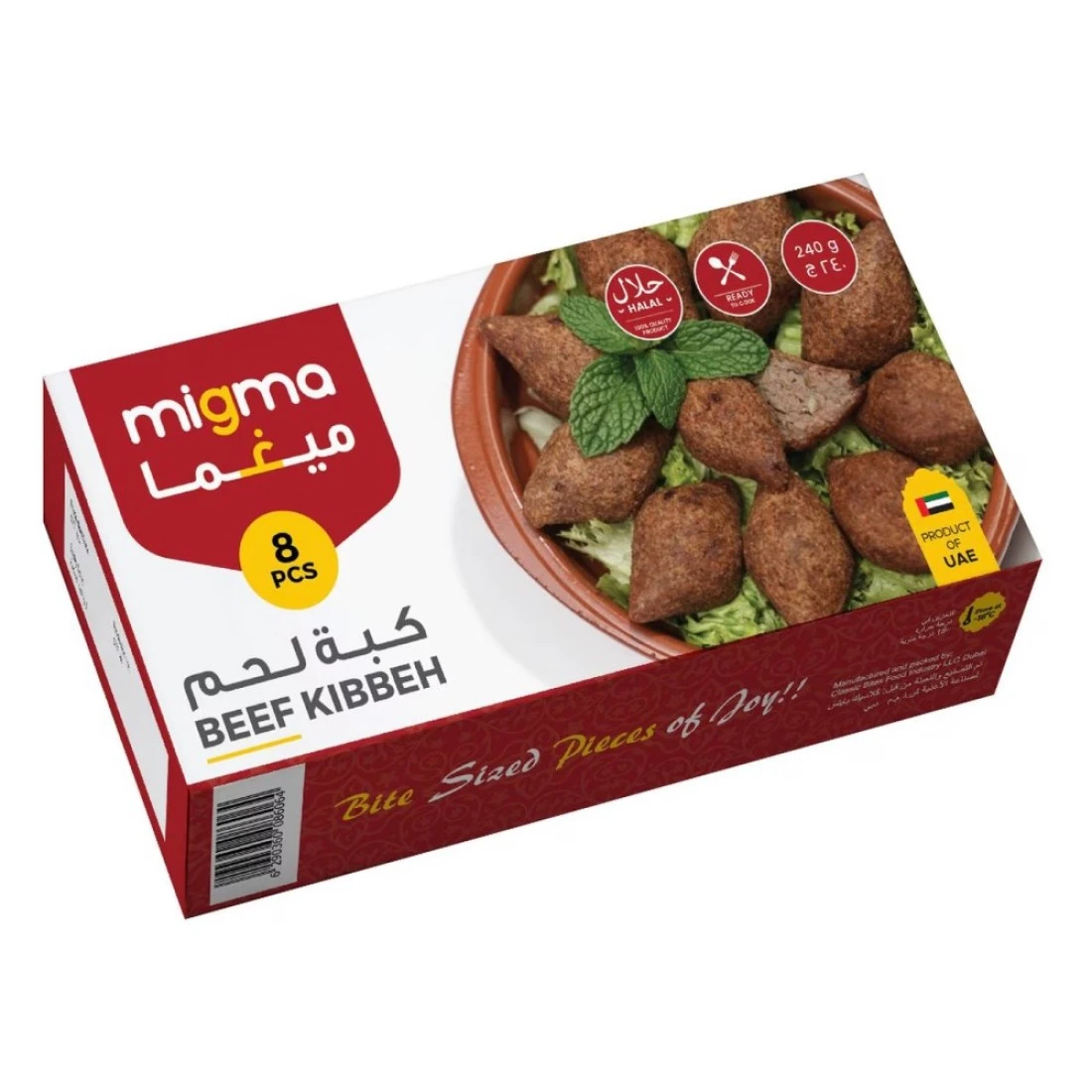 Migma Beef Kibbeh is a delicious Middle Eastern dish that combines high-quality beef with a blend of aromatic spices and fine bulgur wheat. Packaged in a convenient 240g format, this ready-to-cook kibbeh features a unique texture and rich flavours, making it perfect for grilling, baking, or frying. Ideal for serving as an appetizer or a main dish, Migma Beef Kibbeh offers a taste of traditional cuisine that is both satisfying and easy to prepare. Enjoy it with yogurt sauce or fresh salad for a complete meal experience.