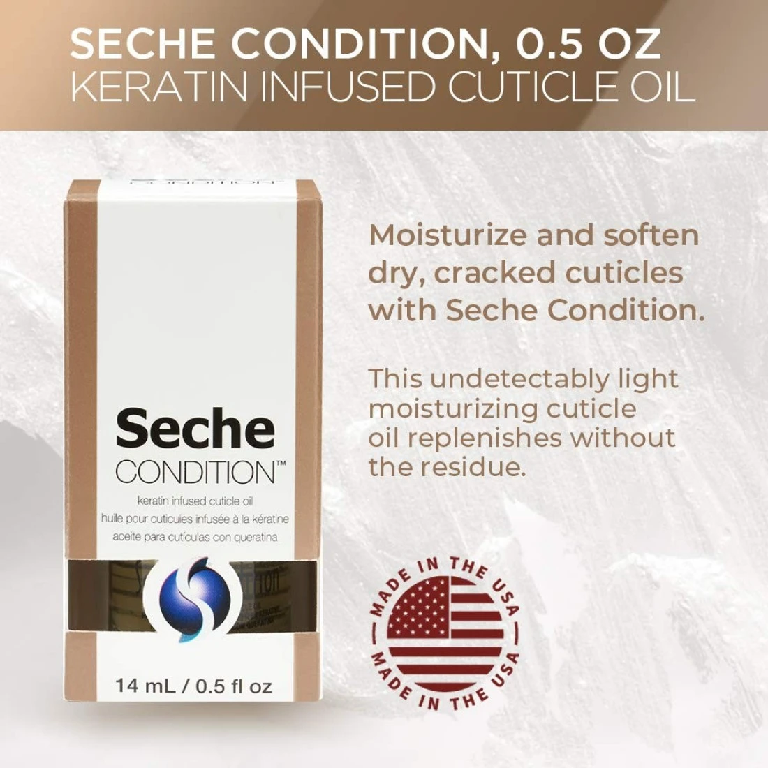 GET HEALTHY CUTICLES IN ONE SWIPE: A powerful cuticle treatment oil perfect for nourishing neglected fingertips! Seche Condition Cuticle Oil hydrates nails and cuticles. Infused with nourishing oils that prevent dryness so there will be no hangnails and even nail infections for you! This cuticle oil will help build resilient, flexible nails that are less likely to chip, crack and peel. Gently massage into cuticles daily to keep cuticles smooth, hydrated, and nails looking healthy and strong.MOISTURIZE AND SOFTEN DRY, CRACKED CUTICLES: Seche Condition Cuticle Oil is formulated not only to hydrate cuticles but also to protect and strengthen your nails! Credit its combo of Keratin, a nail reinforcement agent, Jojoba Oil, a fast-absorbing oil known for mimicking the oils naturally found in your skin.NON-GREASY, FAST-ABSORBING FORMULA: Looking for a cuticle oil that doesn’t require you to wait around for it to soak in? Seche Condition Cuticle Oil is your ticket! A miracle fix cuticle treatment that soothes dry, flaky cuticles back into fighting shape! Not only that! This makes your nail beds look neat and tidy with zero grease in sight, too! It also absorbs quickly so you can get back to your life without accidentally leaving oil stains on everything you touch! Just wow!HANDY DAILY CUTICLE TREATMENT OIL: Keeping your cuticles in check, Seche Condition Cuticle Oil is an easy way to revitalize and hydrate your cuticles and nails. It is formulated to deeply nourish your fingertips