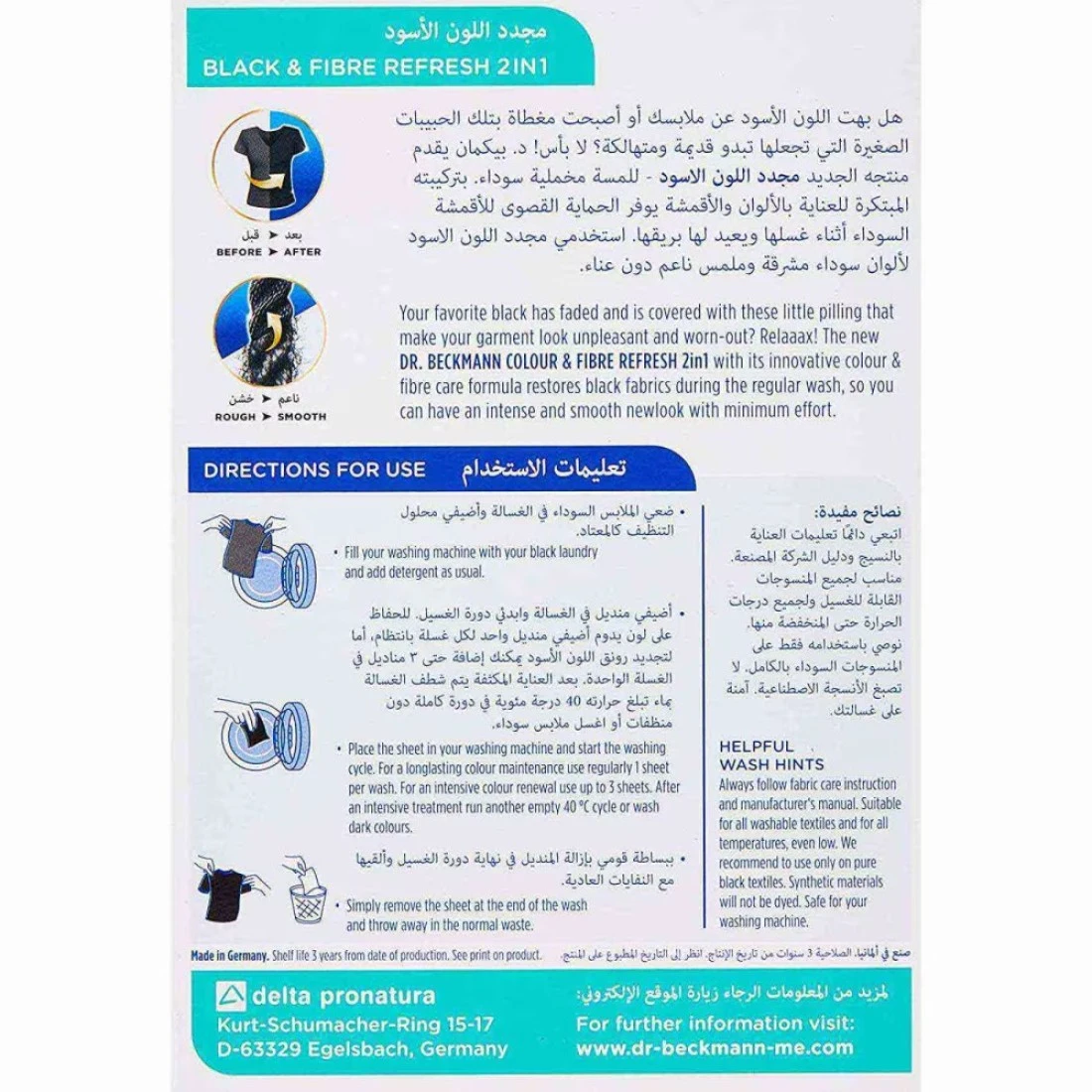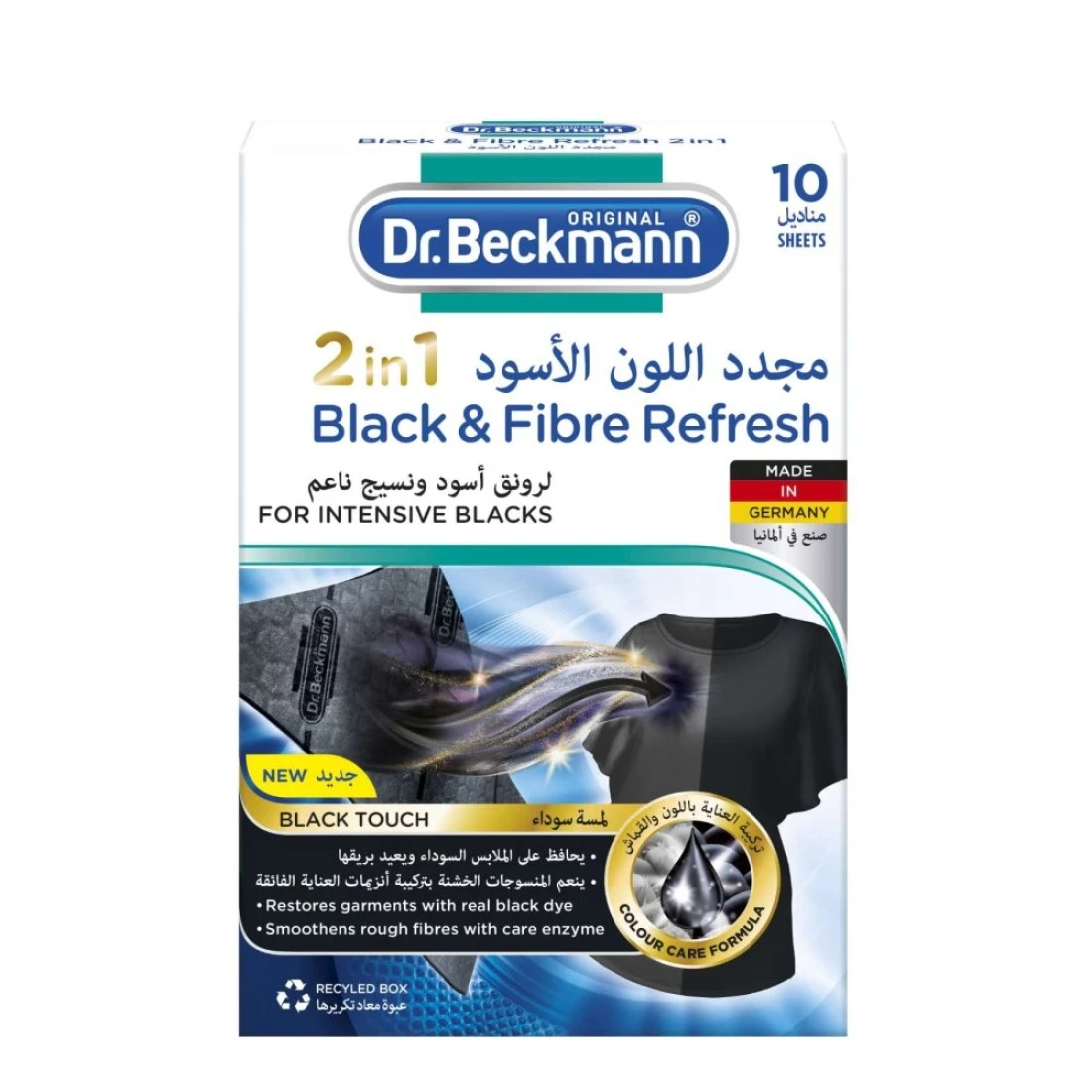 - The new Dr.Beckmann colour and Fibre Refresh 2 in 1 with its innovative colour and fibre care formula restores black fabrics during the regular wash so you can have an intense and smooth new look with minimum effort