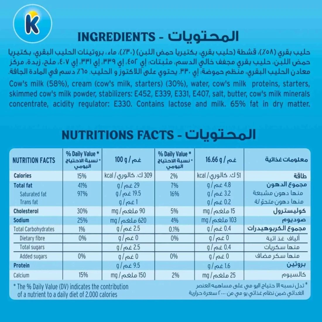ingredients : Ingredients: cow's milk (58%), cream (cow's milk, starters) (30%), water, cow's milk proteins, starters, skimmed cow's milk powder, stabilizers: E452, E339, E331, E407, salt, butter, cow's milk milerals concentrate, acidity regulator: E330. Contains lactose and milk. 65% fat in dry matterconcentrate, skimmed cow's milk powder, stabilizers: E1420, E452, E407, salt, acidityregulator: E331, E330, milk fat. Contains lactose and milk. 55% fat in dry matter