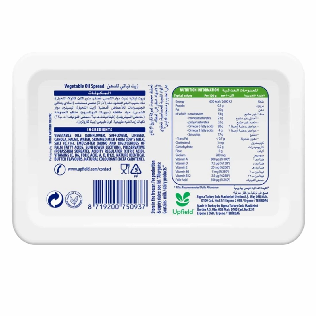 ingredients : Plant Oils (Rapeseed, Palm, Sunflower 3%, Linseed), Water, Salt 1.35%, Plant Based Emulsifier (Sunflower Lecithin), Fava Bean Protein, Natural Flavourings, Vitamins A and D, Flora buys 100% Sustainable Palm Oil
