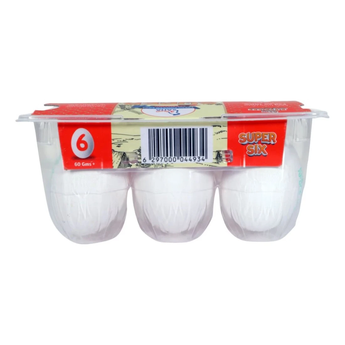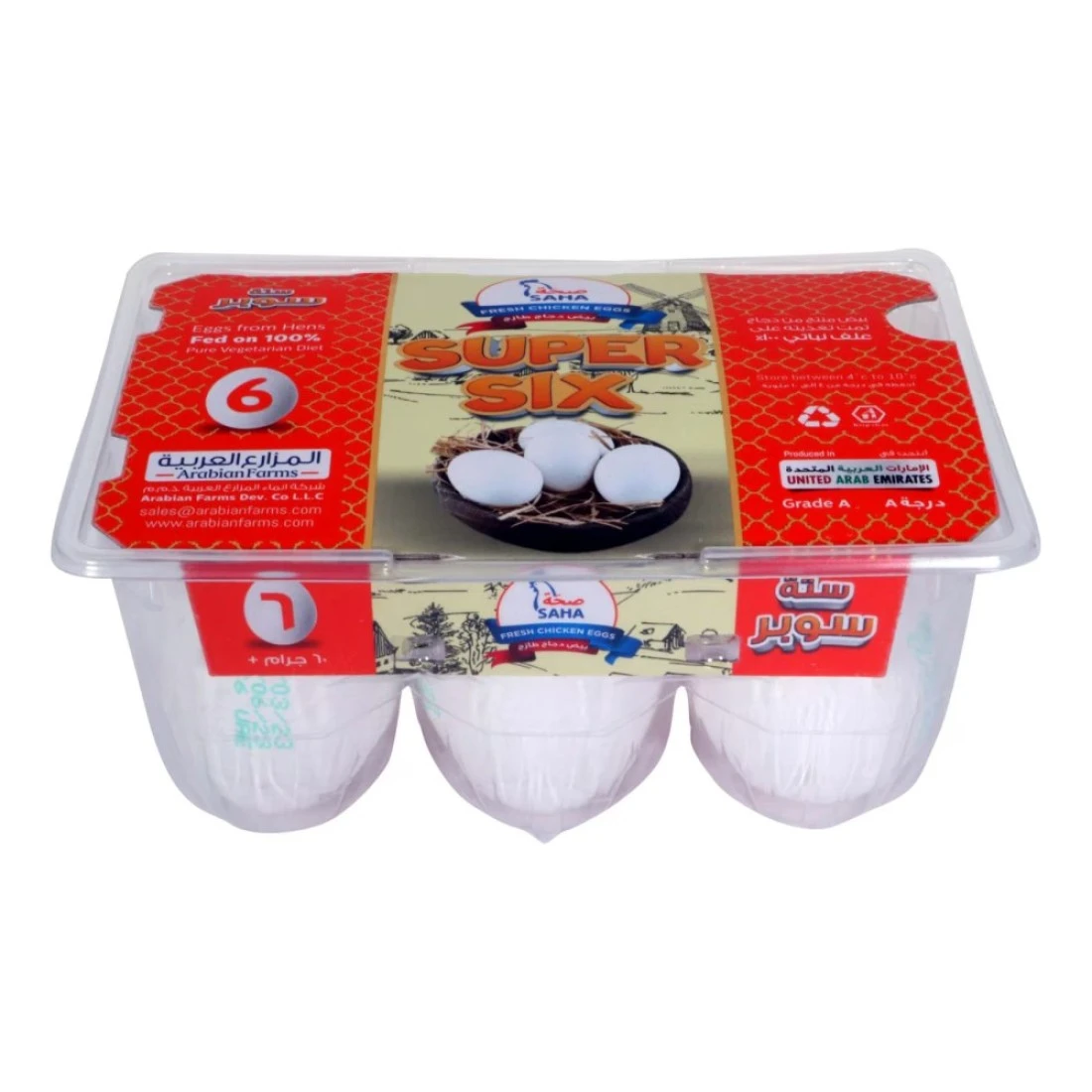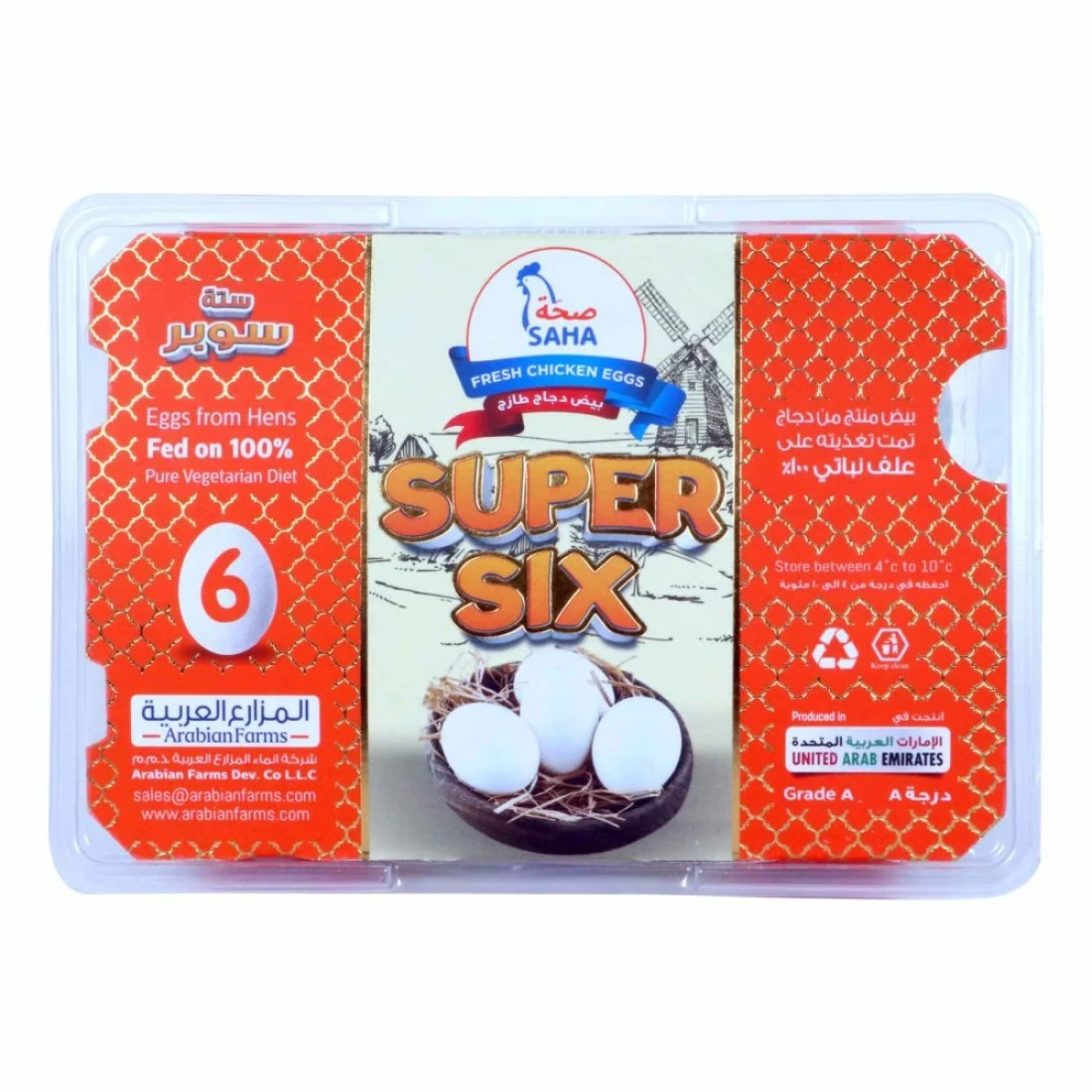 Saha Super Six White Eggs 6 PCS are fresh and high-quality eggs that are sourced from healthy and well-cared-for hens. These eggs are perfect for cooking, baking, or enjoying on their own. They are packed with protein and essential nutrients, making them a nutritious addition to any meal. With their clean and white shells, these eggs are not only delicious but also visually appealing. Whether you're making an omelette, a cake, or a simple scramble, Saha Super Six White Eggs are a great choice.