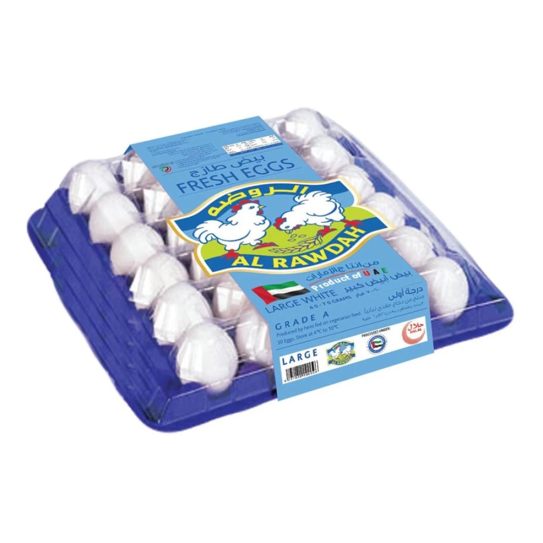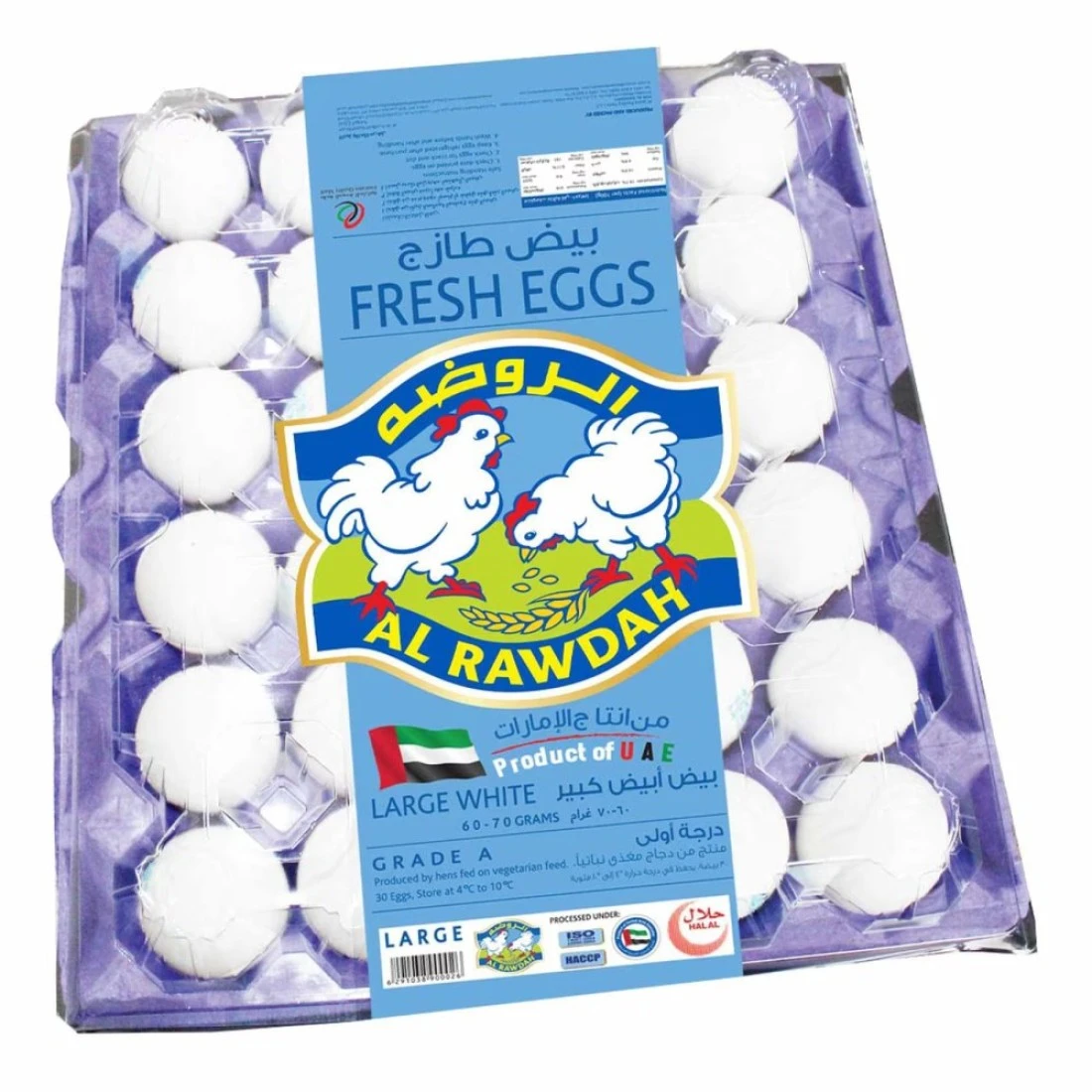 Al Rawdah Fresh White Large Eggs 30 PCS are high-quality eggs sourced from Al Rawdah farms. These eggs are known for their freshness, size, and nutritional value. They are a great addition to any meal and can be used in various recipes. Enjoy the goodness of these eggs in your breakfast, lunch, or dinner.
