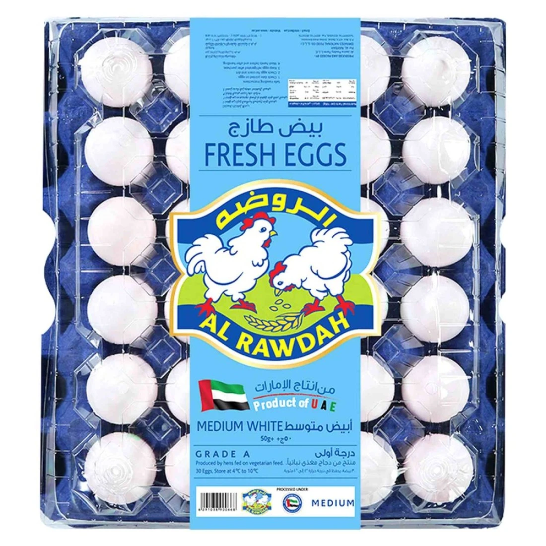 Al Rawdah Fresh White Medium Eggs come in a pack of 30 eggs. These eggs are of medium size and are known for their freshness and quality.