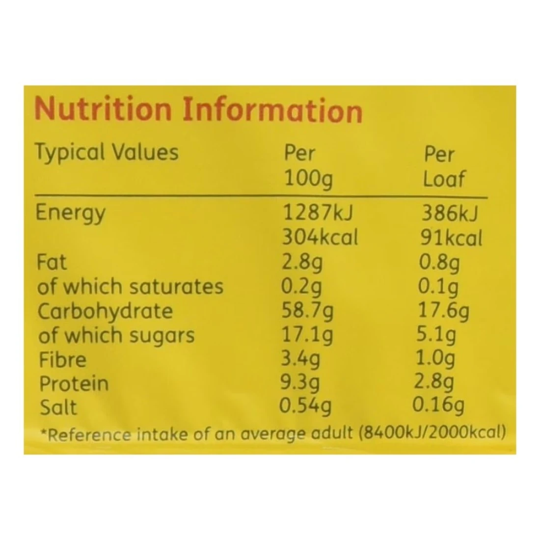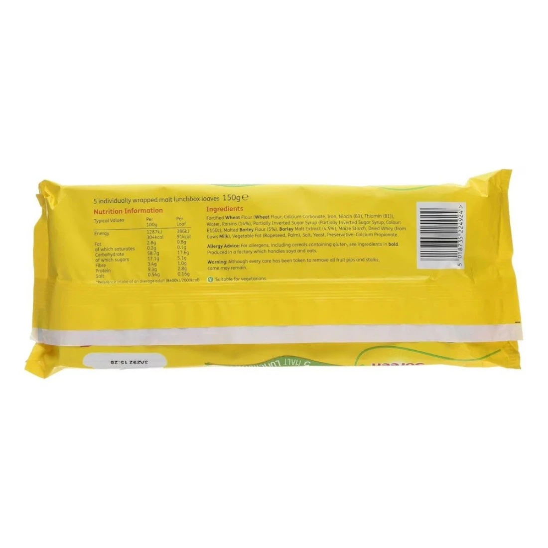 ingredients : Fortified Wheat Flour (Wheat Flour, Calcium Carbonate, Iron, Niacin (B3), Thiamine (B1)), Water, Raisins (14%), Partially Inverted Sugar Syrup (Partially Inverted Sugar Syrup, E150c), Malted Barley Flour (5%), Barley Malt Extract (4.5%), Maize Starch, Dried Whey (From Cows Milk), Vegetable Fats (Rapeseed, Palm), Salt, Yeast, Preservative: Calcium Propionate (Added To Inhibit Mould Growth)