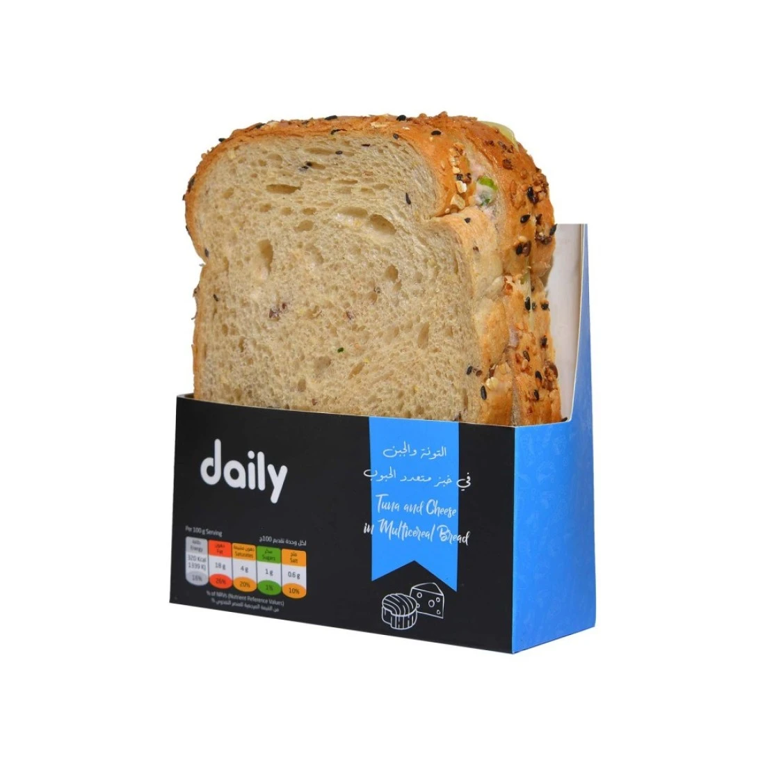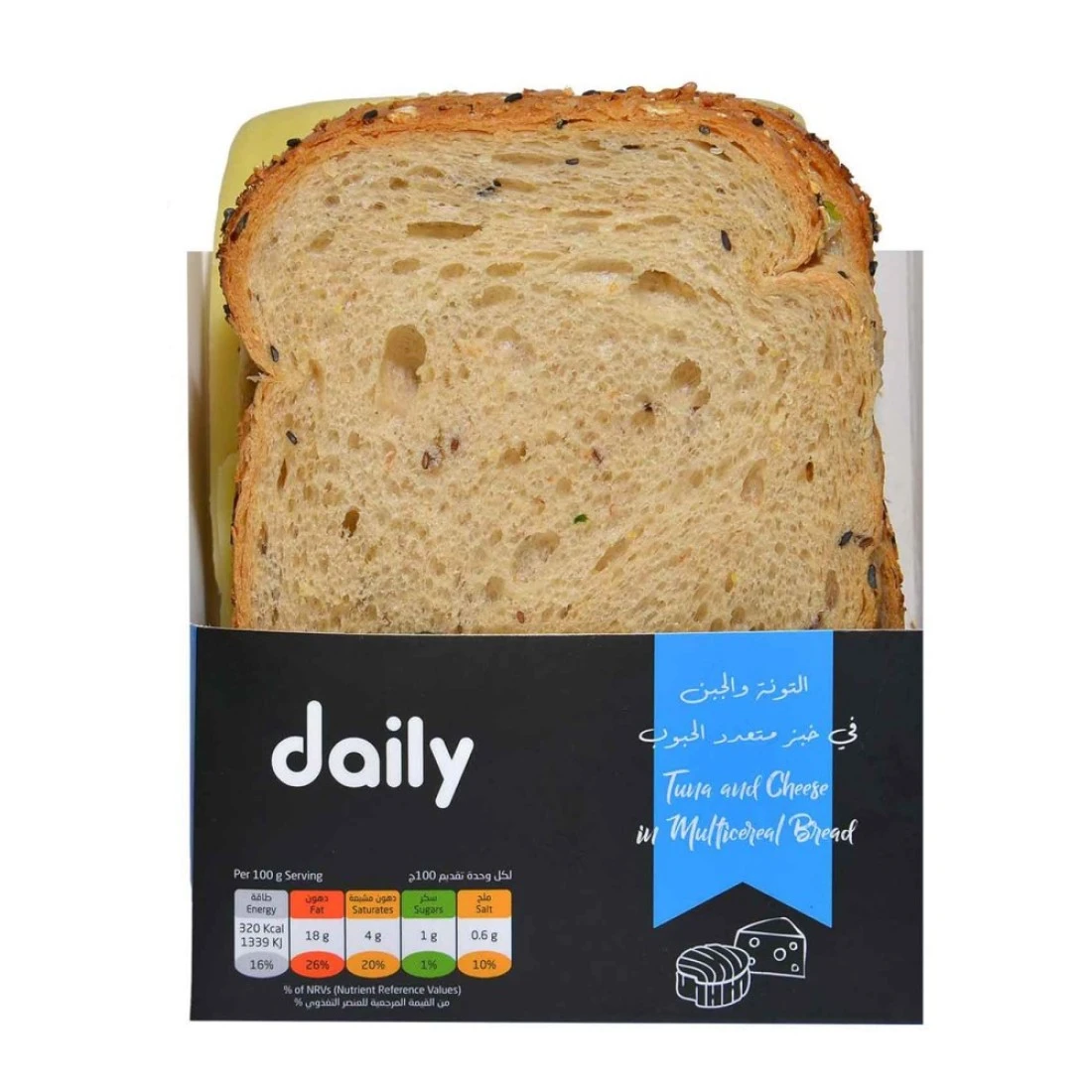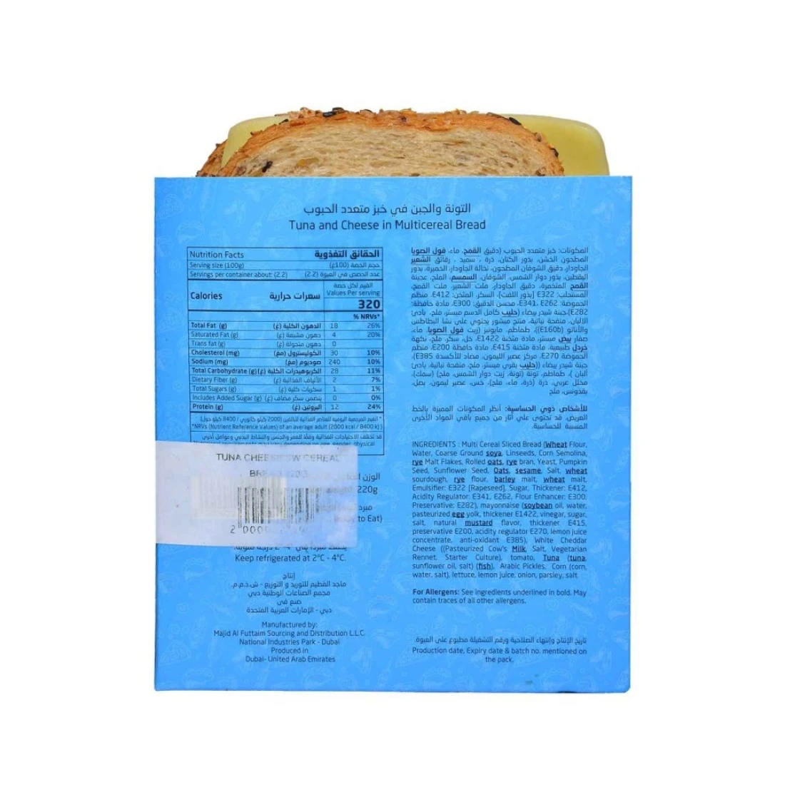 ingredients : Multi Cereal Sliced Bread (Wheat Flour, Water, Coarse Ground soya, Linseeds, Corn Semolina, rye Malt Flakes, Rolled oats, rye bran, Yeast, Pumpkin Seed, Sunflower Seed, Oats, sesame, Salt, wheat sourdough, rye flour, barley malt, wheat malt, Emulsifier: E322 [Rapeseed], Sugar, Thickener: E412, Acidity Regulator: E341, E262, Flour Enhancer: E300, Preservative: E282), mayonnaise (soybean oil, water, pasteurized egg yolk, thickener E1422, vinegar, sugar, salt, natural mustard flavor, thickener E415, preservative E200, acidity regulator E270, lemon juice concentrate, anti-oxidant E385), White Cheddar Cheese ((Pasteurized Cow's Milk, Salt, Vegetarian Rennet, Starter Culture), tomato, Tuna (tuna, sunflower oil, salt) (fish), Arabic Pickles, Corn (corn, water, salt), lettuce, lemon juice, onion, parsley, salt.