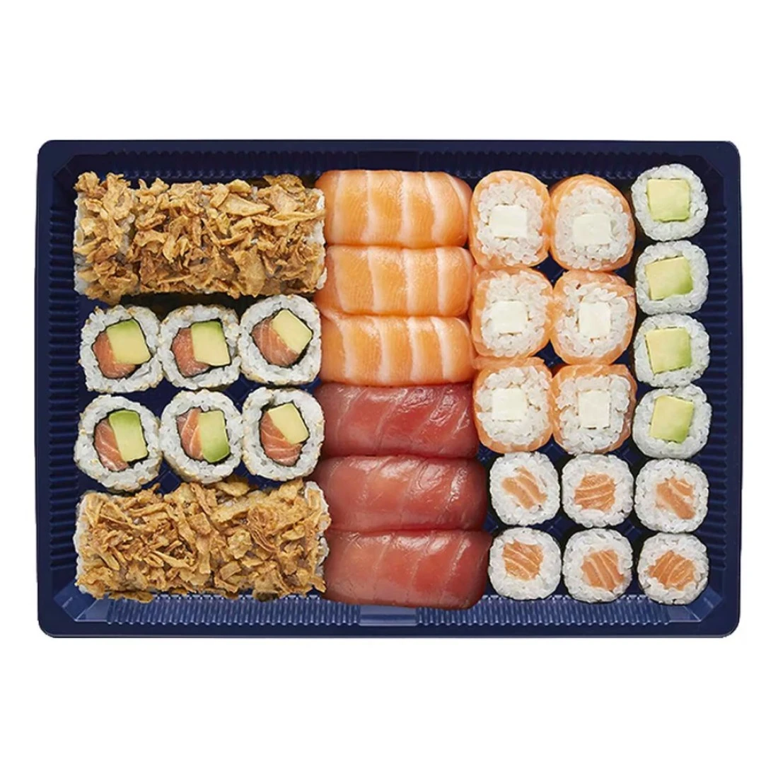 ingredients : Vinegared Sushi Rice, Salmon, Avocado, Cucumber, Tuna, Cream Cheese, Pickled Carrot, Seaweed Salad, Spicy Mayo (Mayonnaise, Sriracha), Fried Onions, Sushi Sauce, Nori Seaweed and White Sesame Seed. One Sushi Daily Hikari Mix is composed of 3 Salmon Nigiri, 3 Tuna Nigiri, 6 Californiafornia Maki, 6 Salmon Maki, 6 Rollin' Salmon Cheese, 4 Avocado Maki and 8 Crunch Veggie Roll.