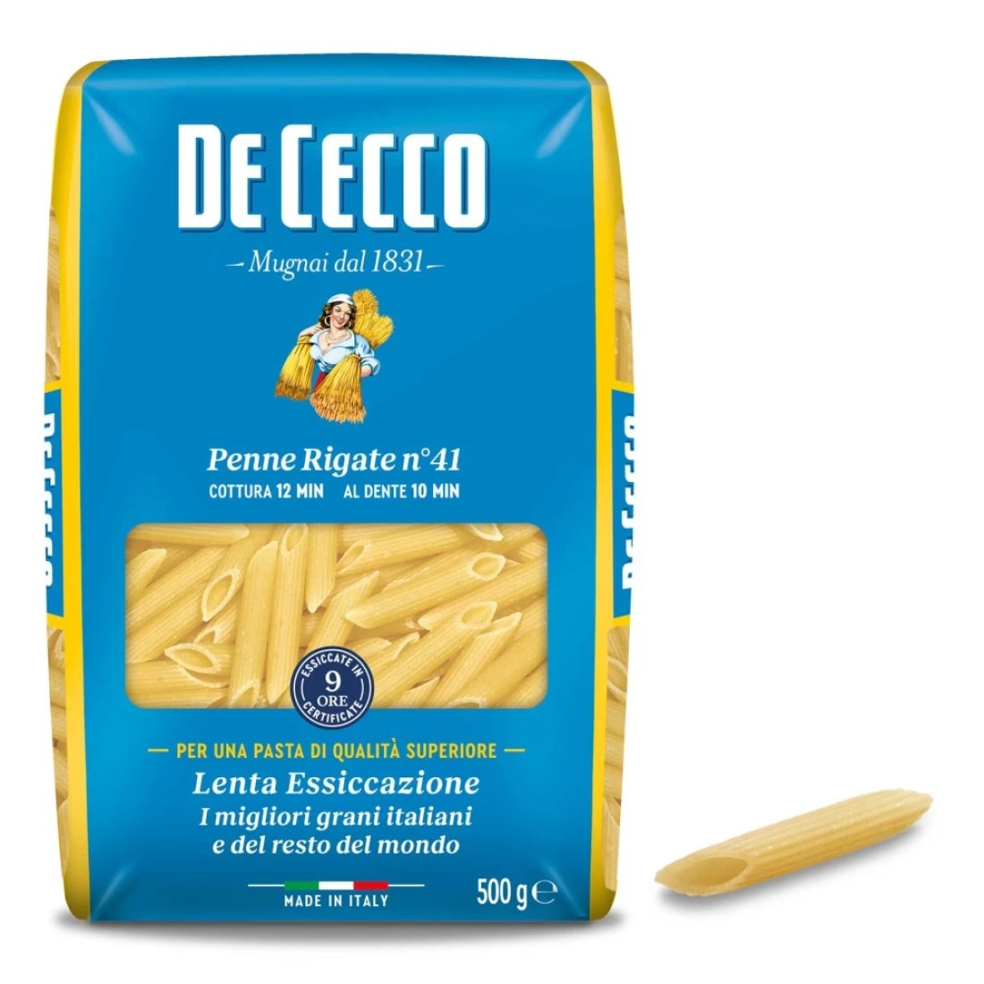 De Cecco Penne Rigate is a type of pasta that is made from durum wheat semolina. It is shaped like a small tube with ridges which helps to hold onto pasta sauce and other ingredients. Each package contains 500g of pasta making it perfect for a family meal or for hosting guests. De Cecco is a well-known Italian brand that is known for its high-quality pasta and their Penne Rigate is no exception. It cooks up perfectly al dente and pairs well with a variety of sauces vegetables and proteins. Whether you're making a classic pasta dish or trying out a new recipe De Cecco Penne Rigate is a great choice for your next meal.